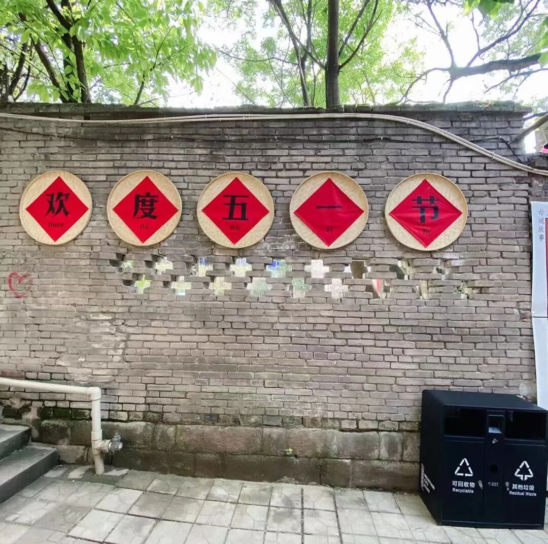 那天在山城巷,是五一前夕,景区已经布置出了节日的氛围。步行道边的一面砖墙上,挂了五个崭新的竹叵罗,用来作“庆祝五一劳动节”几个字的衬底,既喜庆,又质朴。