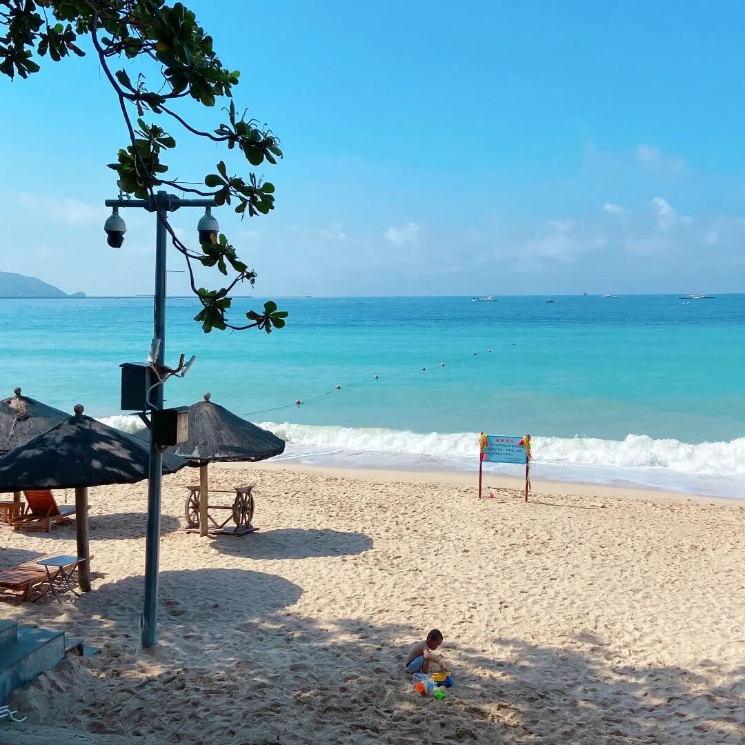 七八点钟,三亚的日光堪称烈炎了。男孩在树荫下,岸边台阶上坐着家长,看不出是妈妈还是奶奶。二胎放开后,已经不容易通过容貌衣着判断亲子关系了。