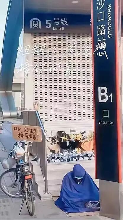 照片中,一位男子坐在地铁站前,身穿深蓝色雨衣,戴着墨镜,身旁自行车上竖着一块纸板,上书:“妞妞:爸爸还想接你回家”。