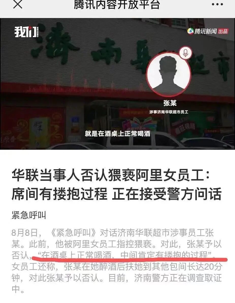 阿里女员工出差济南华联期间,被商家和一名阿里高管灌酒猥亵。