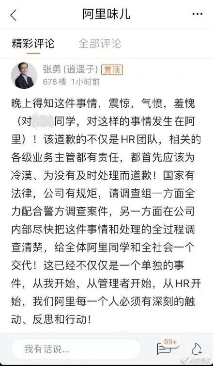 张勇对此事的表示出了“震惊,气愤,羞愧”,要“给全体阿里同学和全社会一个交代”,我相信阿里能做得到。