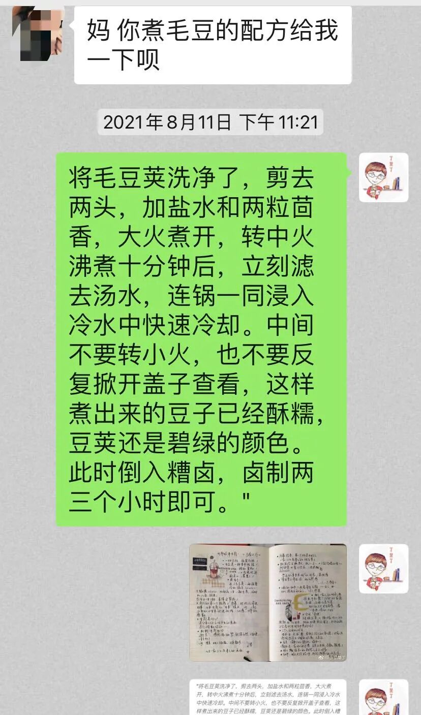 上上周的一天,晚上快十点了,小曦同学发微信说:妈,你煮毛豆的配方给我一下呗。