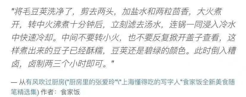 后来读到《有风吹过厨房》,才知道柏邦妮手书的出处。这是一本美食随笔,作者“食家饭”被誉为“厨房里的张爱玲”,“上海懂得吃的写字人”,关于煮毛豆荚,她是这样写的: