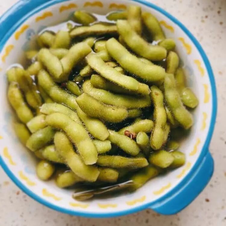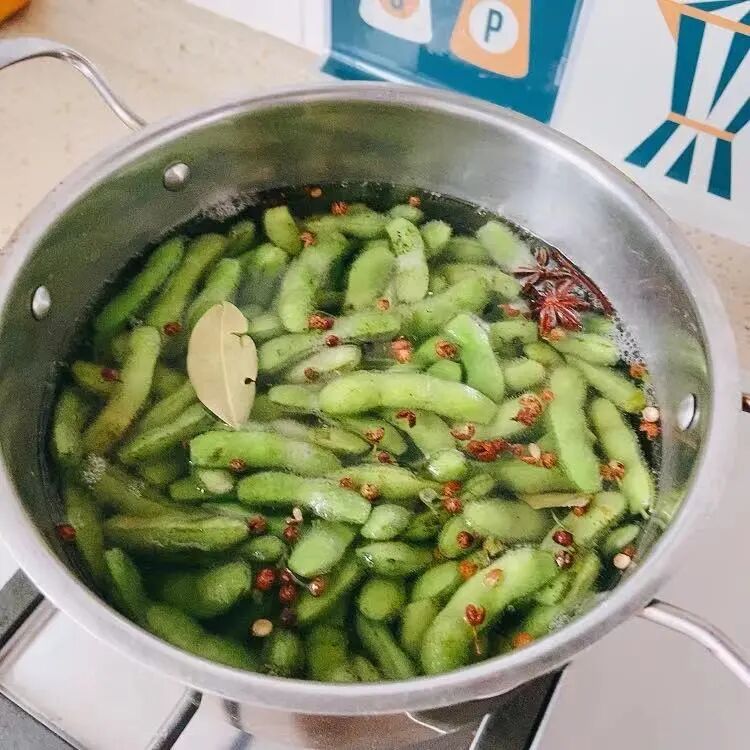 4、煮好的毛豆滤去汤水,连锅一同浸入冷水中快速过凉冷却。汤水不要倒掉,代替原配方中的糟卤,把冷却后的豆荚重新倒进汤水中,浸泡两三个小时即可。也可覆保鲜膜放入冰箱冷藏后两三小时后食用,配啤酒🍺🍻口感更佳。