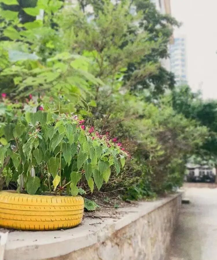 我捡回那个轮胎,在里面填满土,移栽了几株晚饭花。晚饭花也叫粉豆花,我们小时候叫她地雷花,因为结的种子很像一颗颗的小地雷。