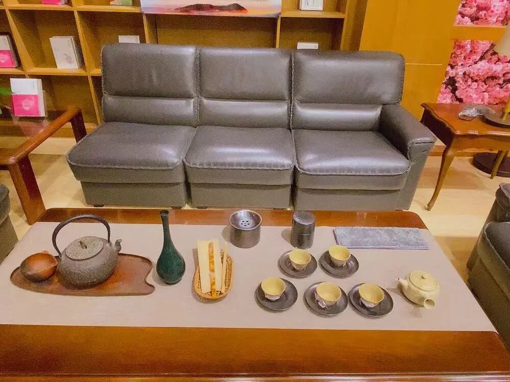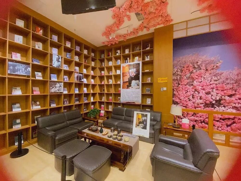 书房一角摆的一组真皮沙发,扯了绳子做了隔离,怕人坐上去吧。仔细一看,旁边竖了个水牌,说是渡边纯一书房的原件。