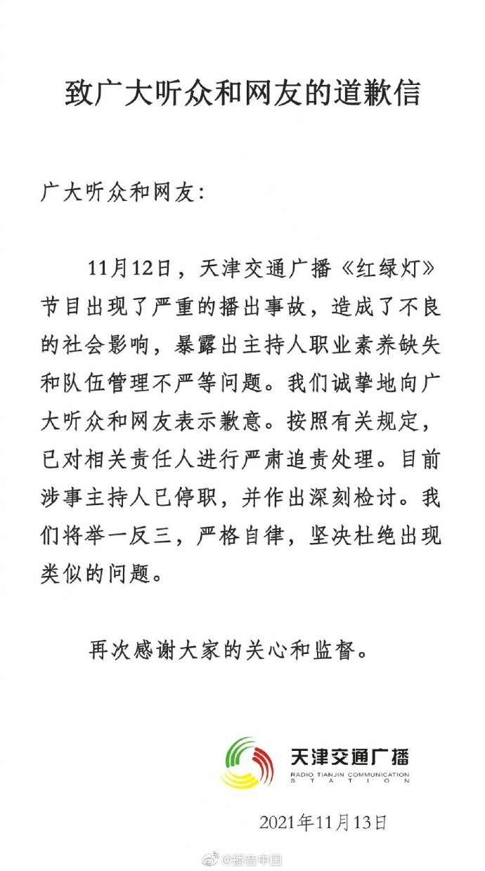 上周五,天津交通台两位主持人在节目中起了争执,男主播摔门而去。
