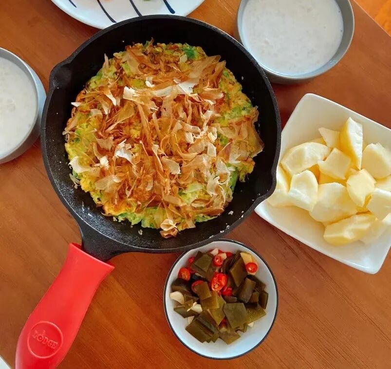 端上来一吃。我就不屑了。切,不就是包头菜切切碎加点面粉鸡蛋烙个饼吗?我也会做。上面洒的那层木鱼花,一般超市不售卖,网上多的是。