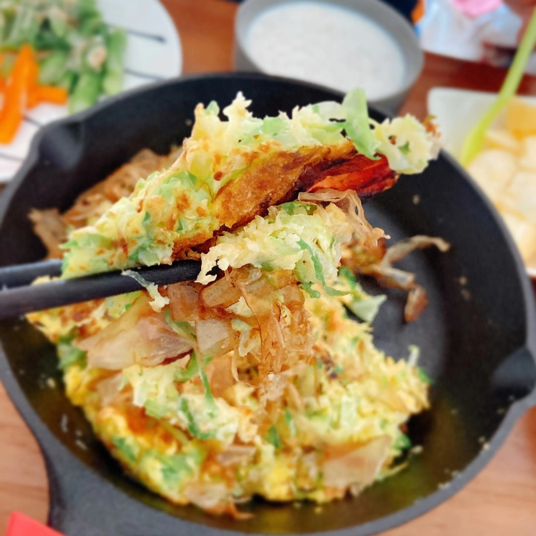 大阪烧是一种简单易做的蔬菜煎饼,具有浓郁的日式风味。可以根据个人口味加肉馅、虾仁等食材,我喜欢在锅底铺两片培根,不易糊锅,口味更独特。每每趁热吃着,都内心膨胀,以为自己——可以开店了。