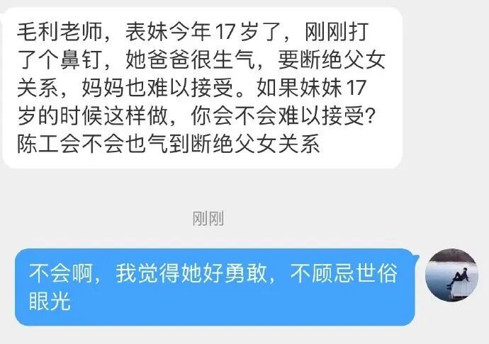 有网友问毛利老师,说她表妹17岁,刚刚打了个鼻钉,她爸爸很生气,要断绝父女关系,妈妈也难以接受。如果妹妹17岁的时候这样做,你会不会难以接受?陈工会不会也气到断绝父女关系?