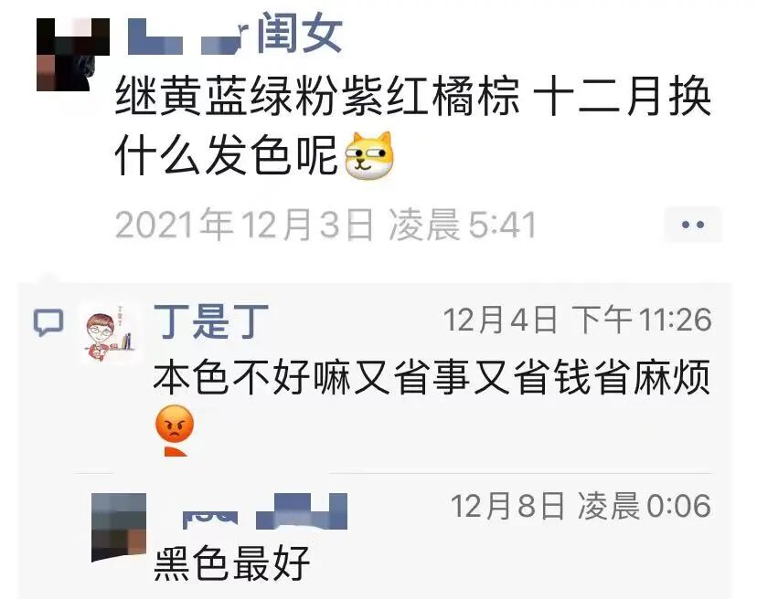 小曦同学已经20出头,她最近的一条朋友圈是12月初,发了条文字“继黄蓝绿粉紫红棕,十二月换什么发色呢”。