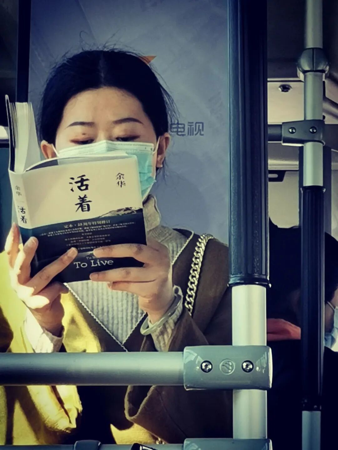 床头柜上放着几本睡前书,最上面一本是《活着》。