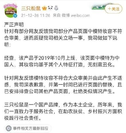 事情是这样的。近日,有网友晒出零食品牌“三只松鼠”产品宣传海报,海报中的“眯眯眼”妆容被部分网友认为是在故意丑化国人形象,引起争议。