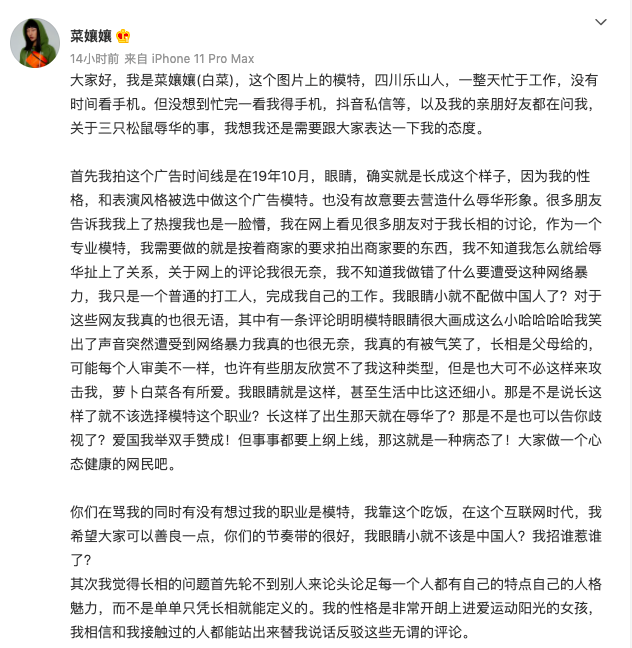 就像广告模特菜孃孃回应的:我的眼睛小我就不配做中国人了吗?