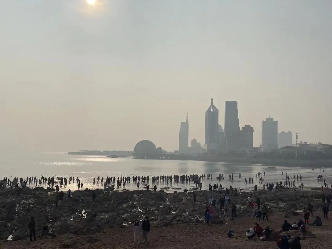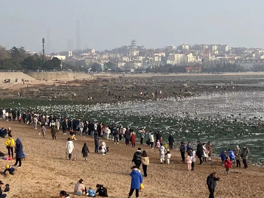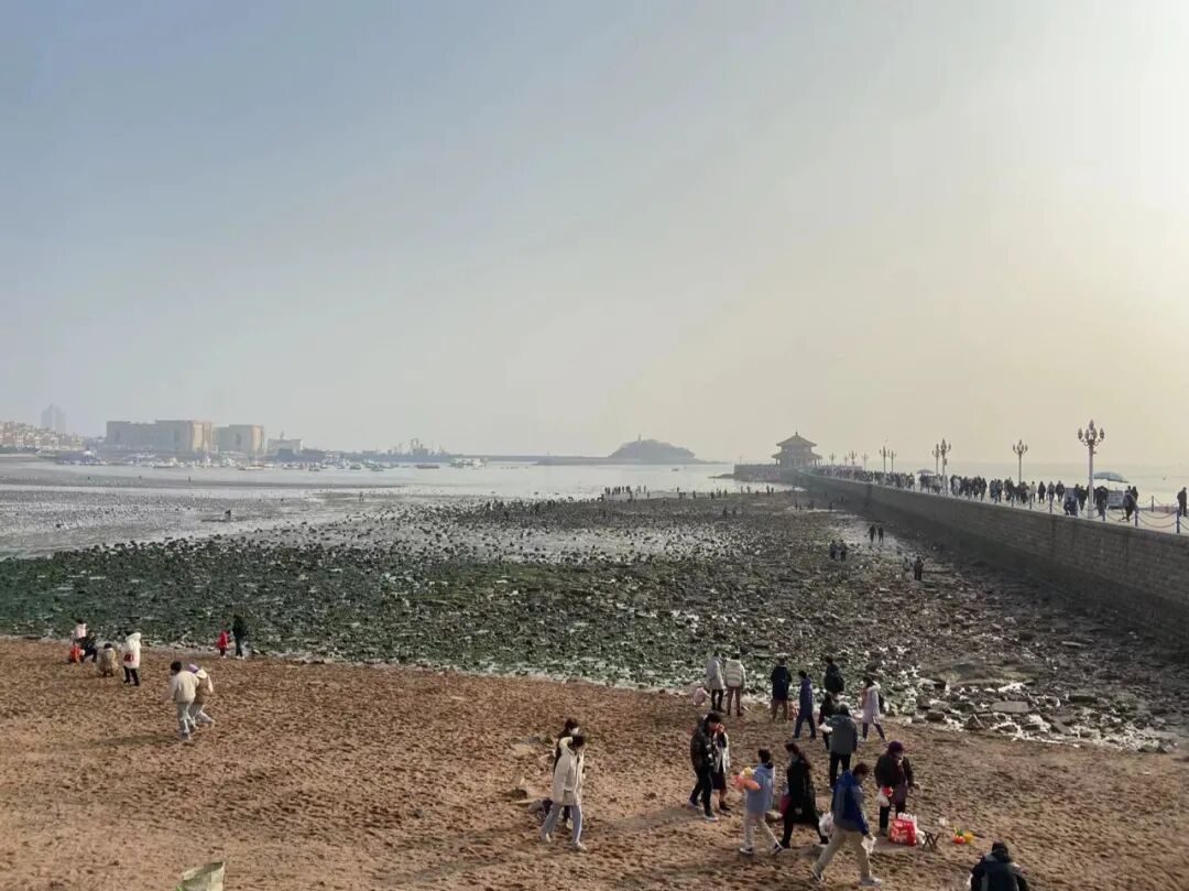 天文大潮退潮。潮水退到了栈桥尽头的回澜阁。