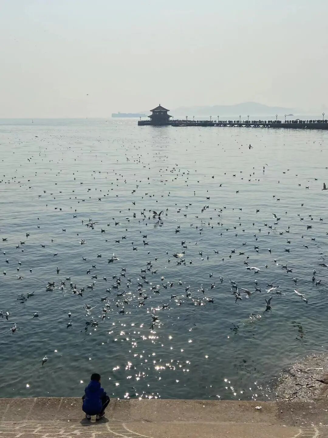 冬日的栈桥,是海鸥的聚集地。以前可能没有如此大规模,也许是海鸥们一传十,十传百,知道这里的游客会投喂食物,所以纷至沓来,场面蔚为壮观。