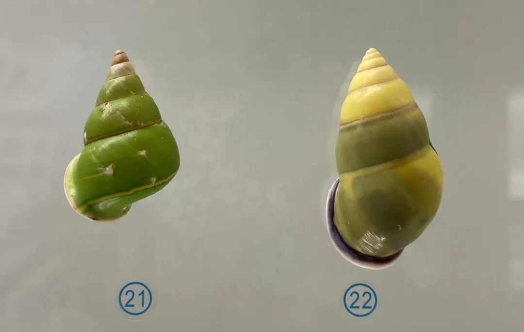我最喜欢的一种,因为颜色是绿的。“绿巴布亚蜗牛”。这种蜗牛并不都是绿的,“只有生活在最高的树顶上的才呈绿色生活在树干上呈黄色。”