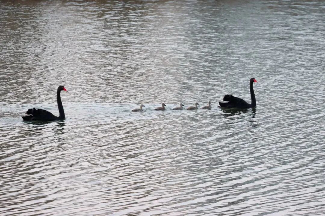 不是一大片天鹅,是一家七口,前面引领着的是爸爸,后面收尾的显然是妈妈,中间五只颜色灰灰,长大后才能变成黑天鹅的,是它们的孩子。