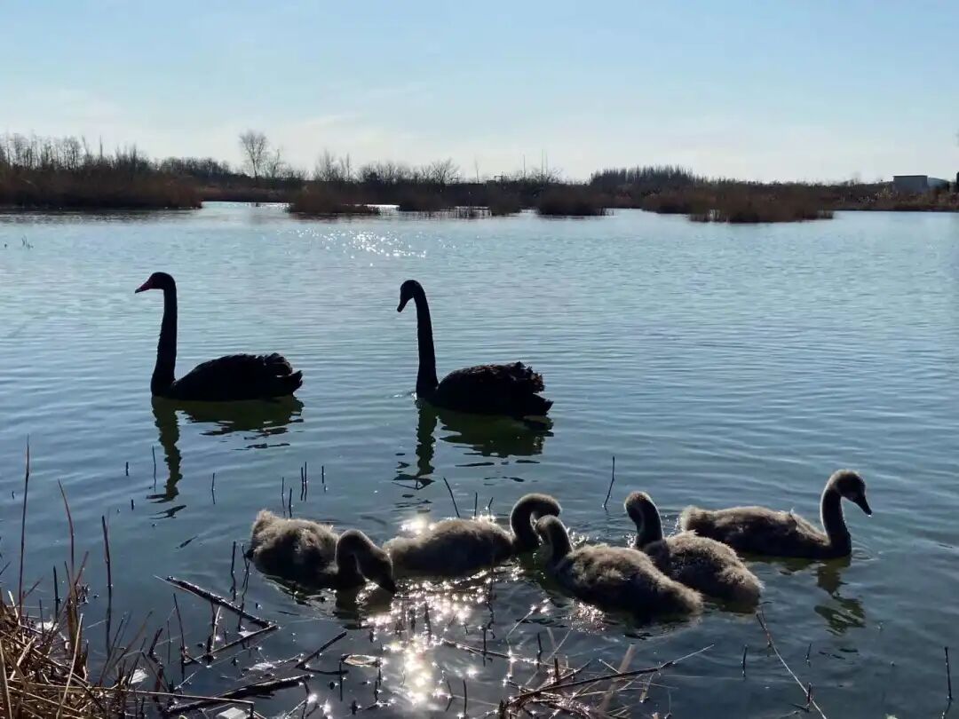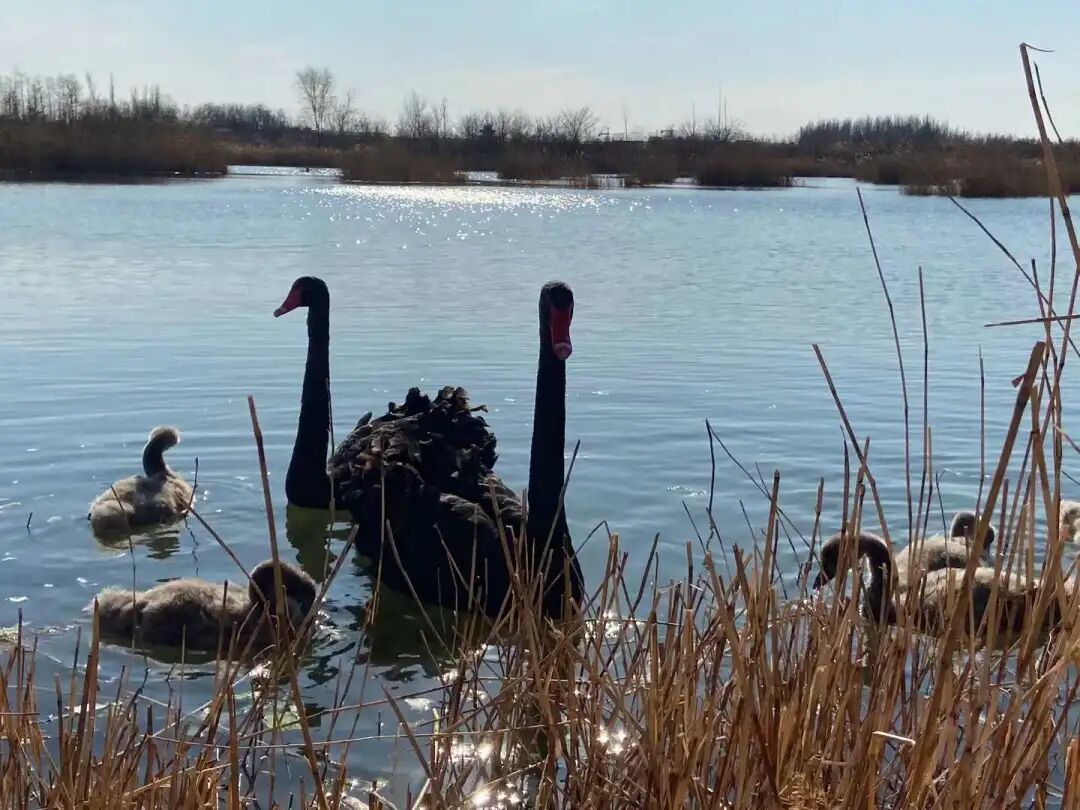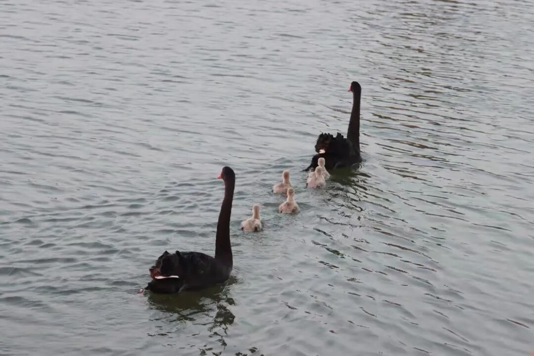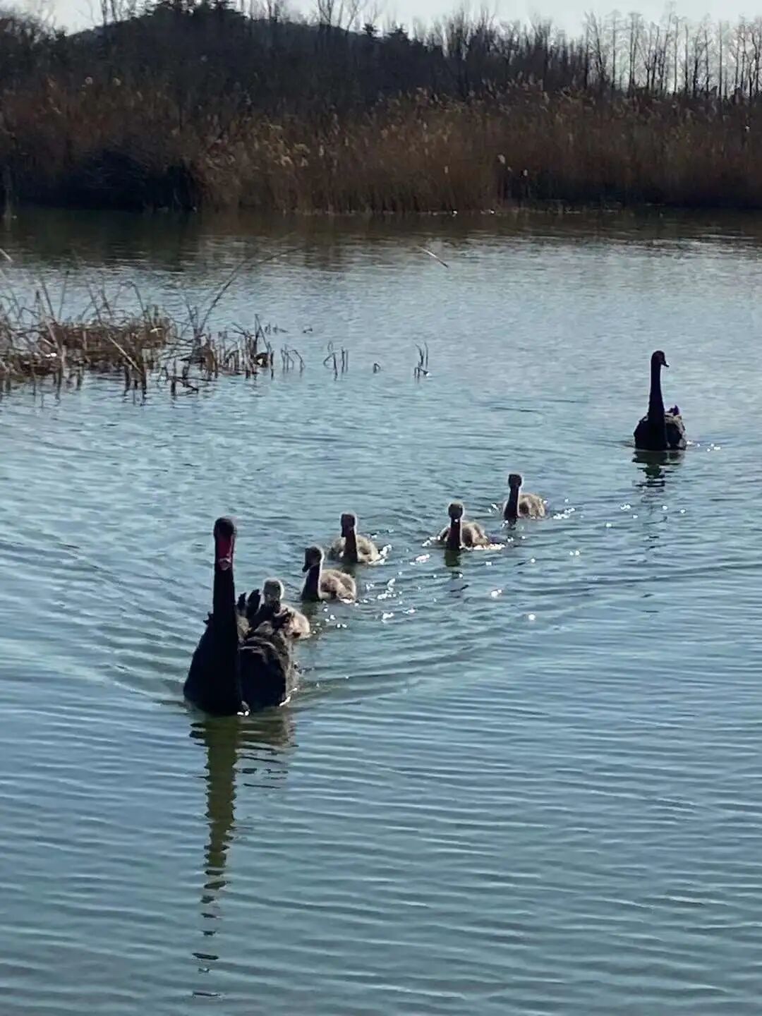 但是,当看到一只黑天鹅优雅地游出芦苇荡,离我们越来越近;当一名身穿景区黄色工装的工作人员像唤家禽一样呼唤着“鹅鹅鹅”,向水中抛洒白菜叶;当岸边守候着跟拍天鹅的摄影师说,它是在寻找家人;当看到天鹅一家陆陆续续游过来,越来越近,近在咫尺……