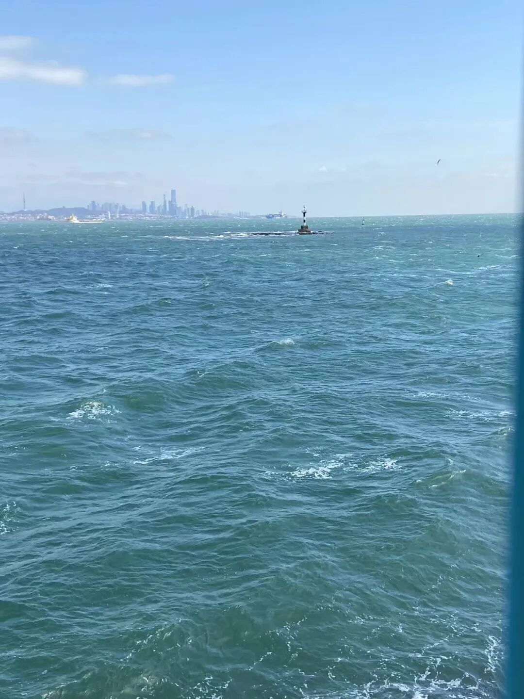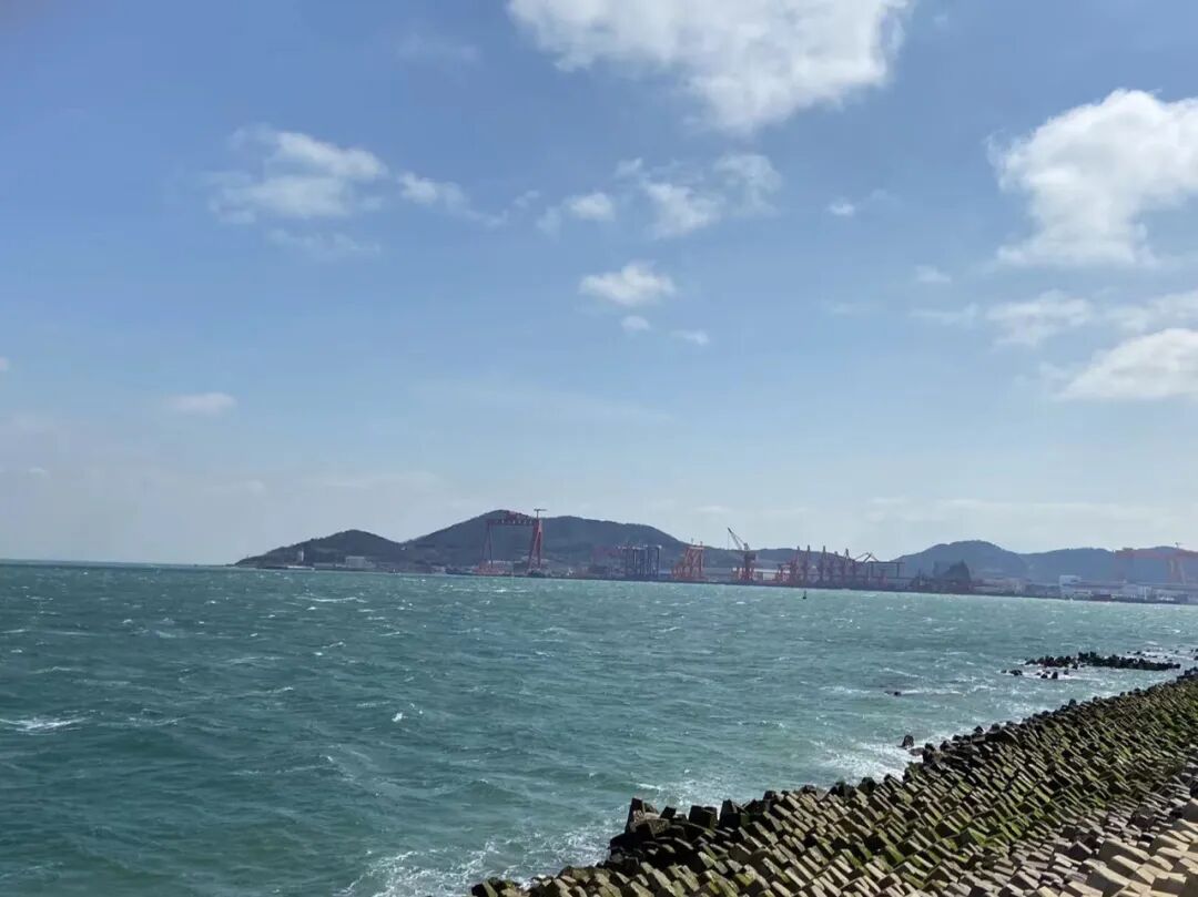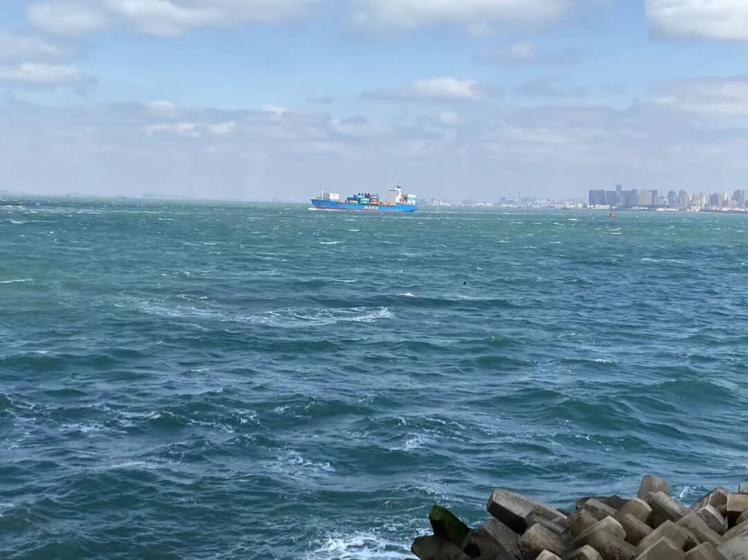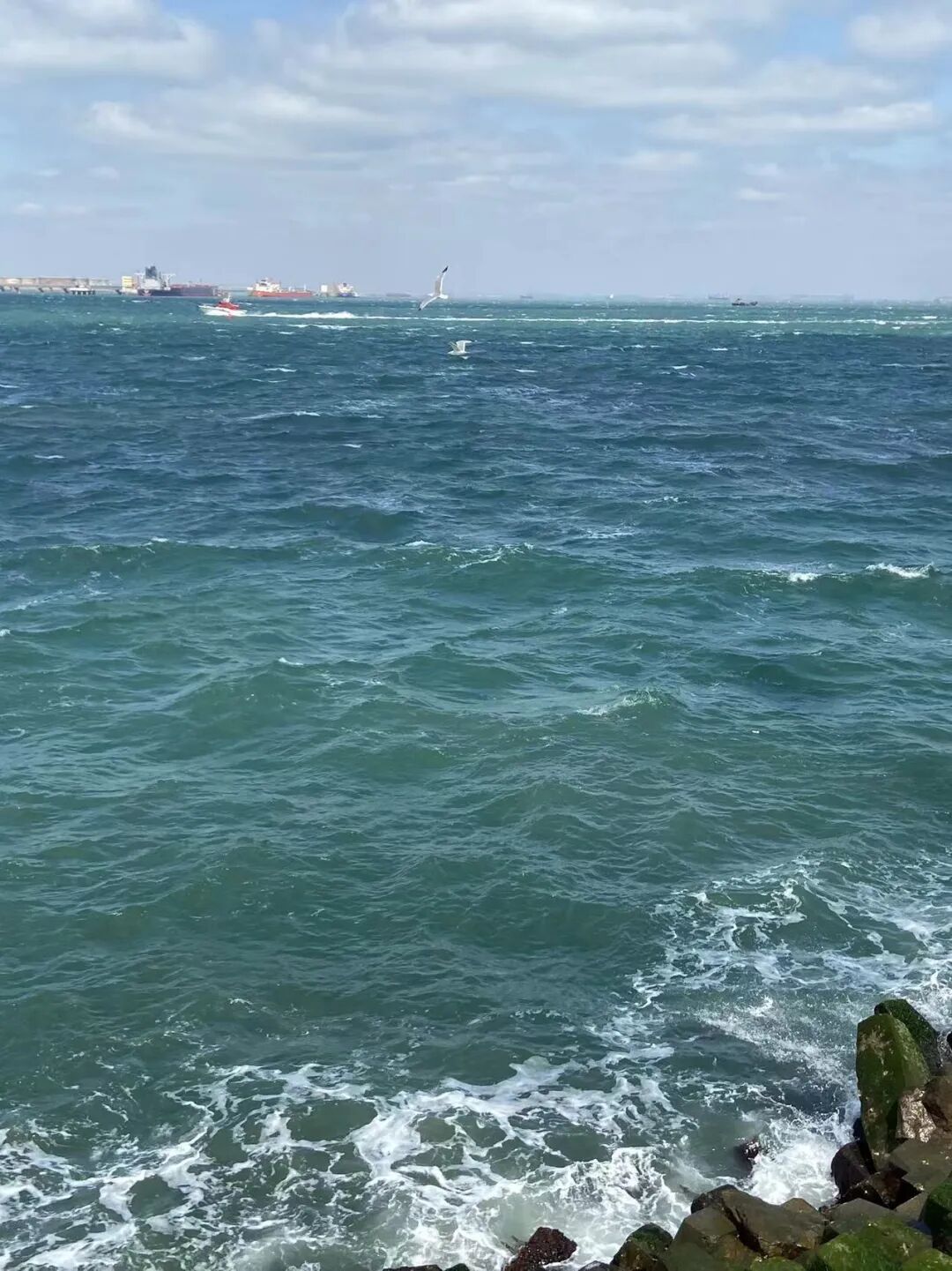 风大,浪急。蓝色的大海上,卷起一排排的海浪。那海浪因风向没有冲击防波堤,使得一湾海水看来来更像河流一般。这才想到,“风乍起,吹皱一池春水。”这水,也可能是海水啊。