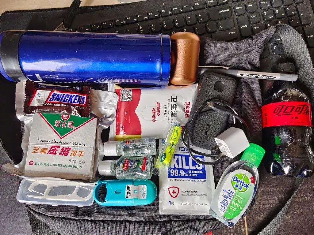 充电宝,充电线,插头,一个保温杯,一小盒茶叶,两块士力架,一包压缩饼干,一包牙线,小瓶漱口水,湿厕纸,消毒凝胶,外套里边多穿件坎肩(万一隔离了铺着盖着都行)