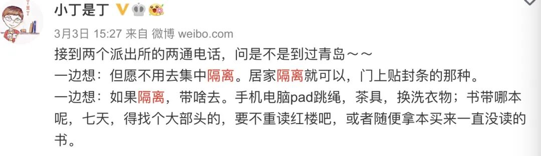 上月我回临沂,第二天青岛西海岸发现阳性病例。我被社区,派出所,防疫部门同时联系,差点以为要去隔离。当时就想到:假如我去隔离,会带什么。还发了条微博。