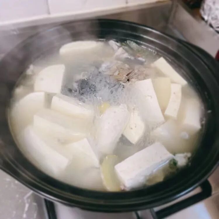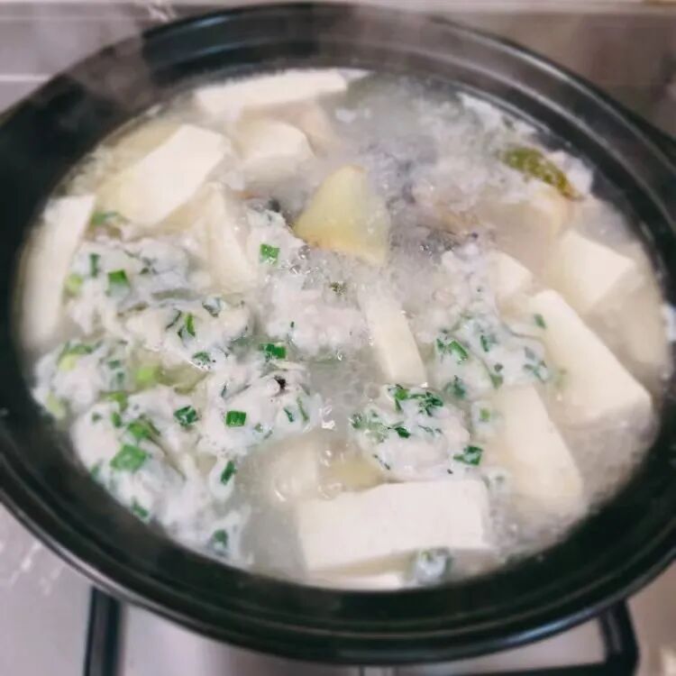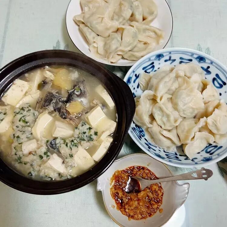 同时,把处理的鱼头鱼尾和鱼骨煮了豆腐汤。包水饺剩下的一点馅料也当丸子下到了汤里。