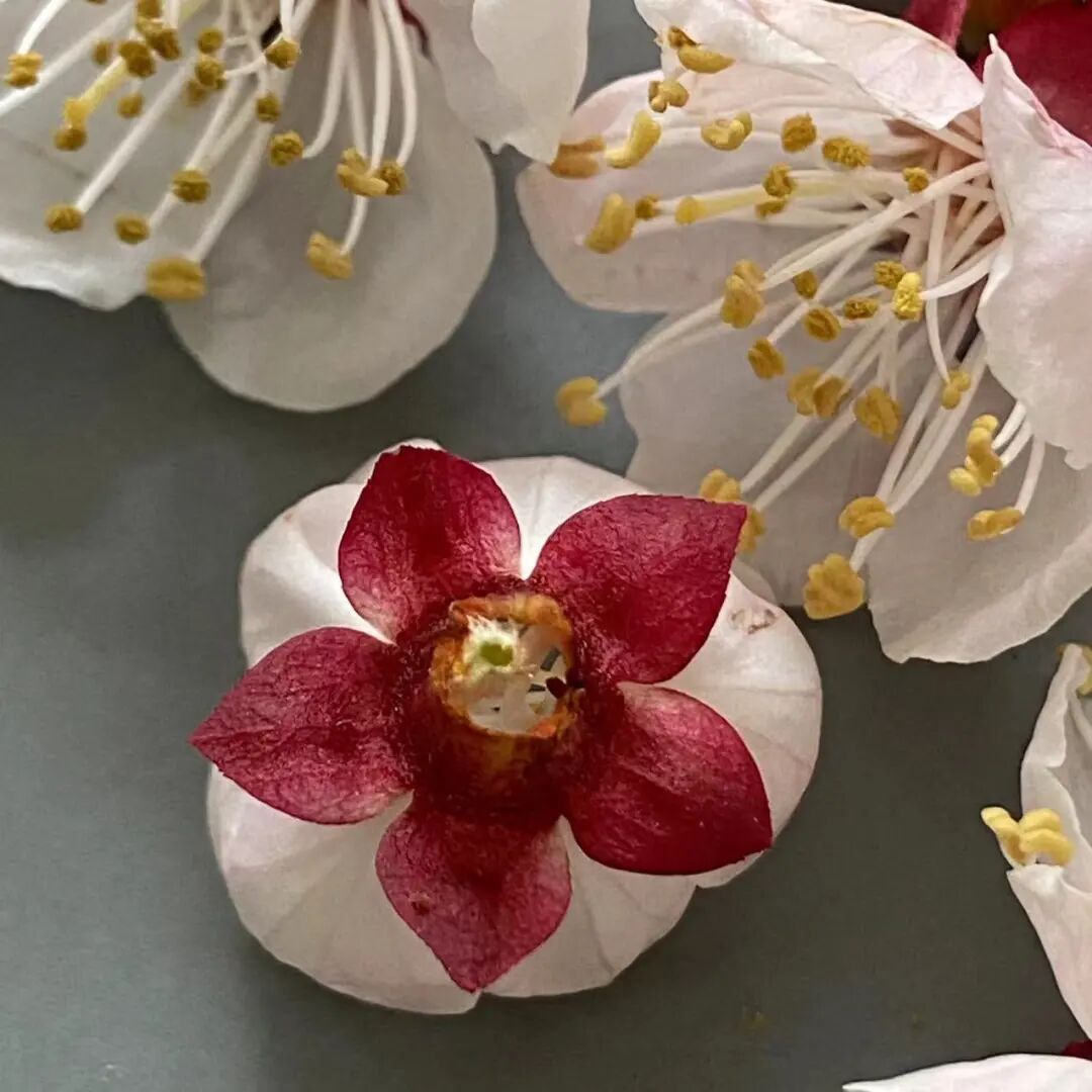 若不是近观杏花,我哪知道她的形态跟梅花很像呐,连杏花的花蒂还是叫花托,也是红色五瓣,一朵花的另一面,也是一朵花。