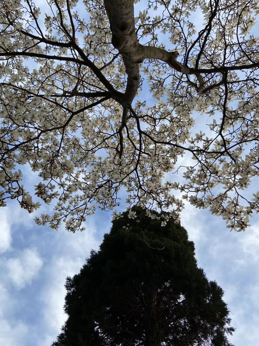 这几天天气晴好,每天我都会跑到吊床上晃荡一会儿,抬头就能看到一树繁花。玉兰花期短,也许跟樱花杏花比起来,玉兰的花期也算长了,但我眼见它一整个冬天含苞的辛苦,绽放了也没几天,大片的花瓣就纷纷掉落,难免伤春。