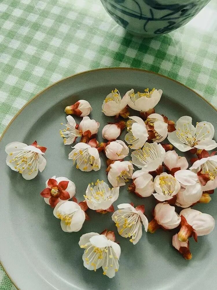 我心疼那些落花。忍不住捡了些,放到盘子里,细细观赏。从来没有如此近距离地欣赏杏花,还挺好看的,也有香味。谁说杏花没有香味?