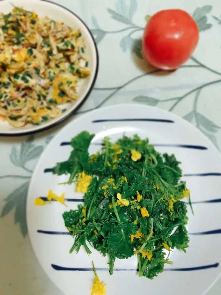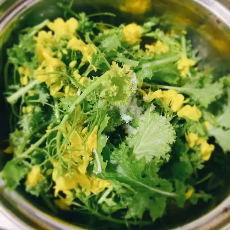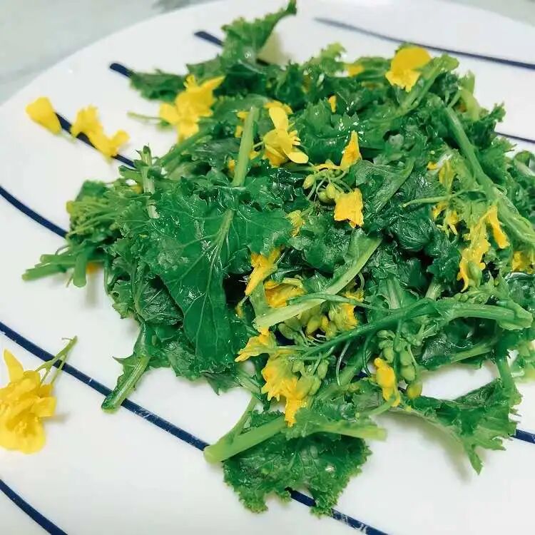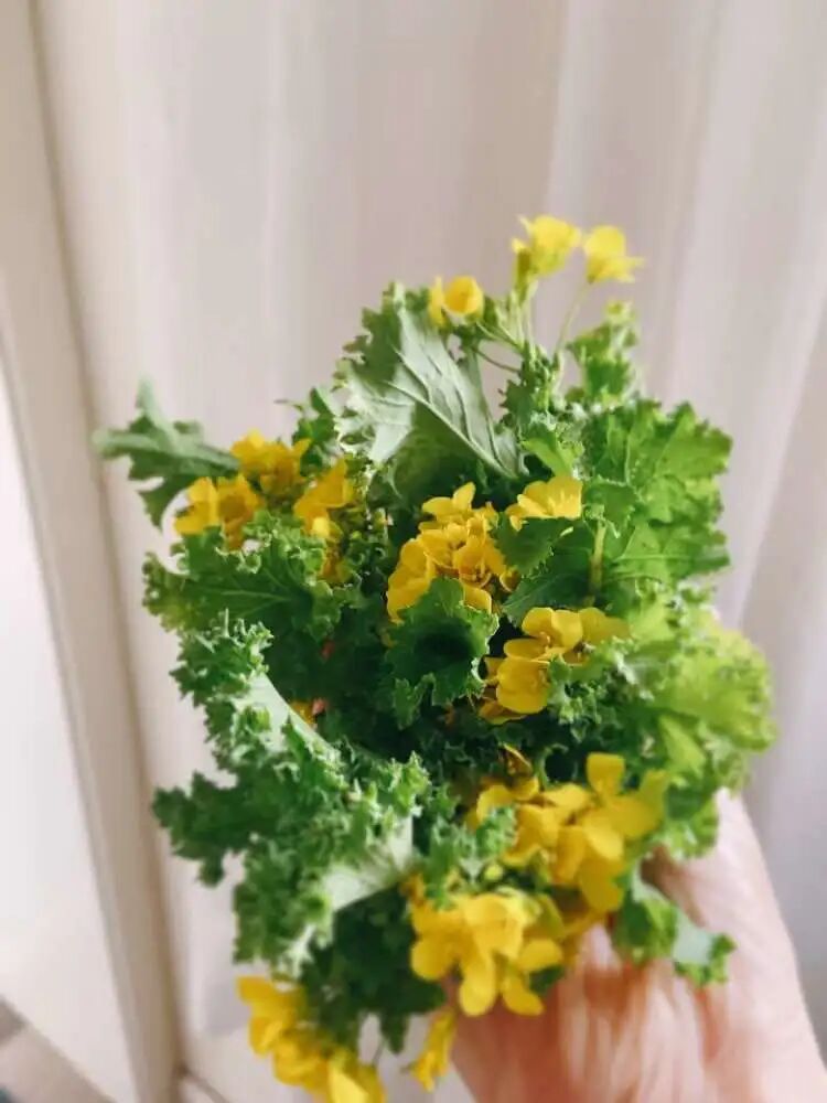 我不是会过日子嘛。又想到“上海人民都吃不到菜”的梗,更是觉得那菜扔了可惜。就蹲在地上捡呀捡呀,连菜带花择了一小把。拿开水焯了,倒进焙煎芝麻沙拉酱拌了一下。