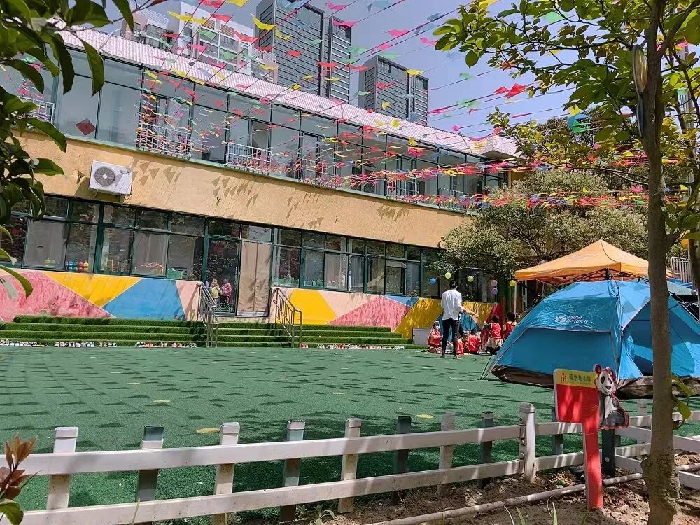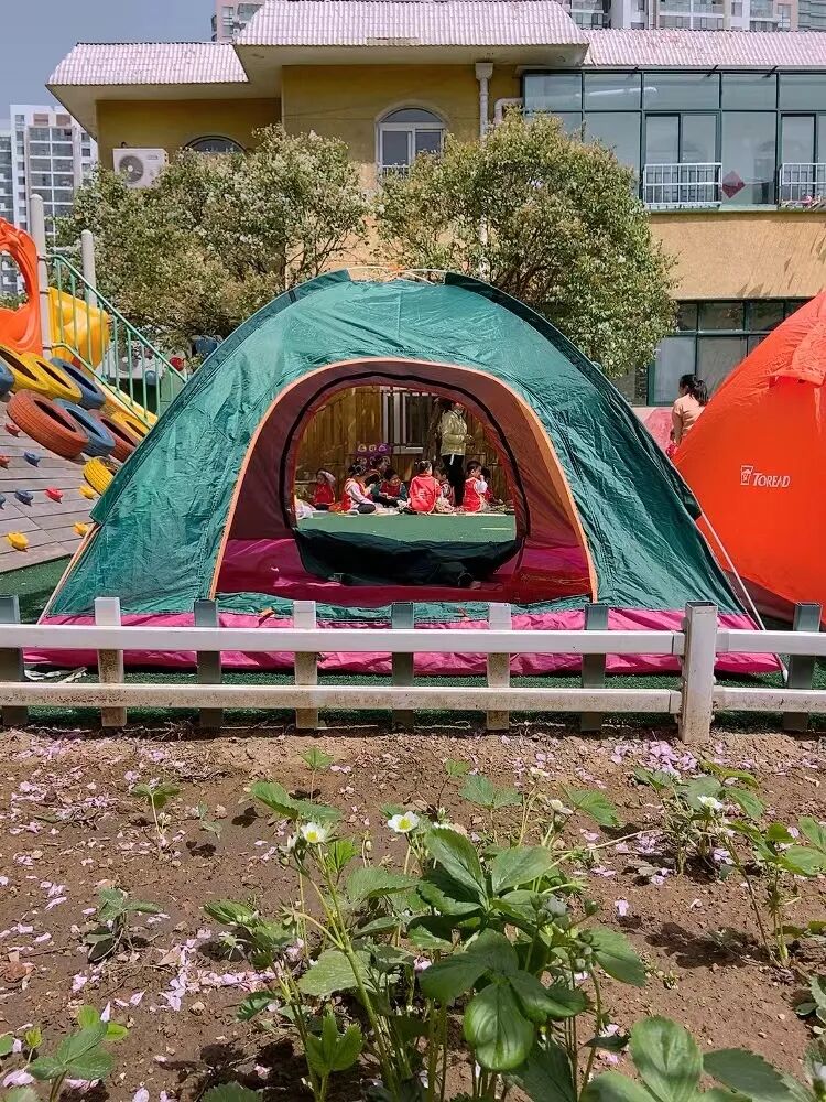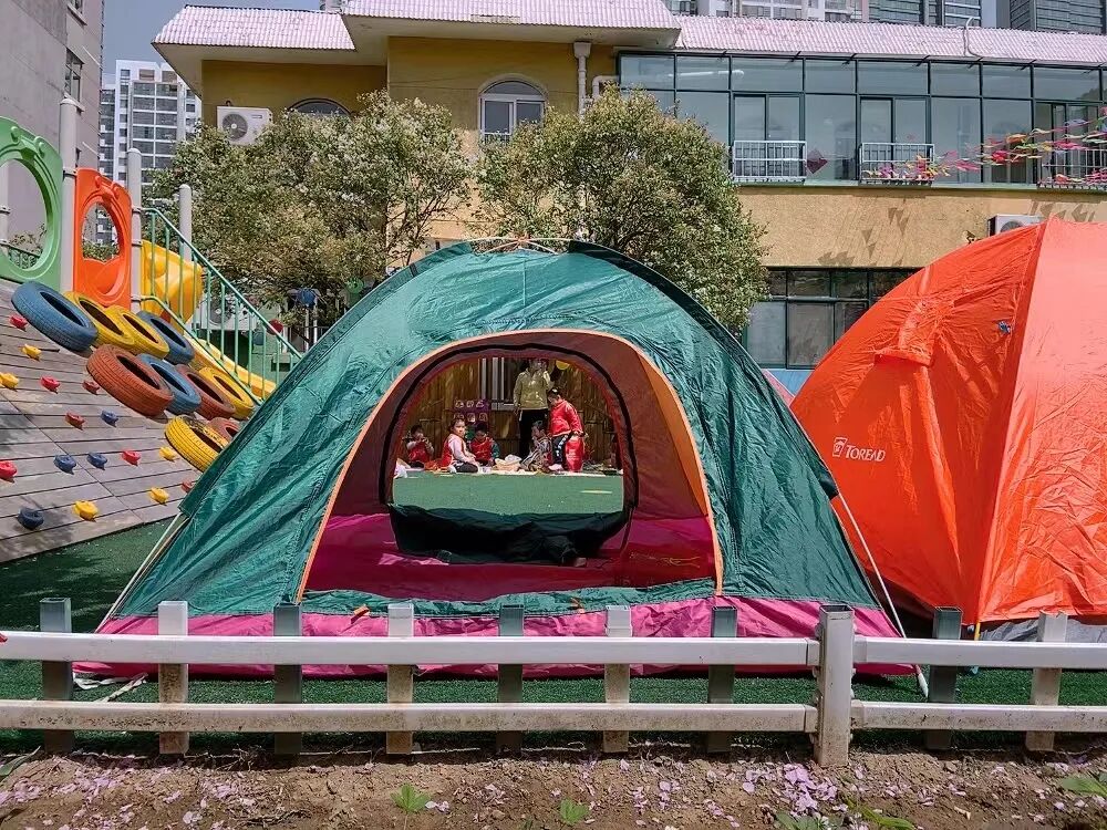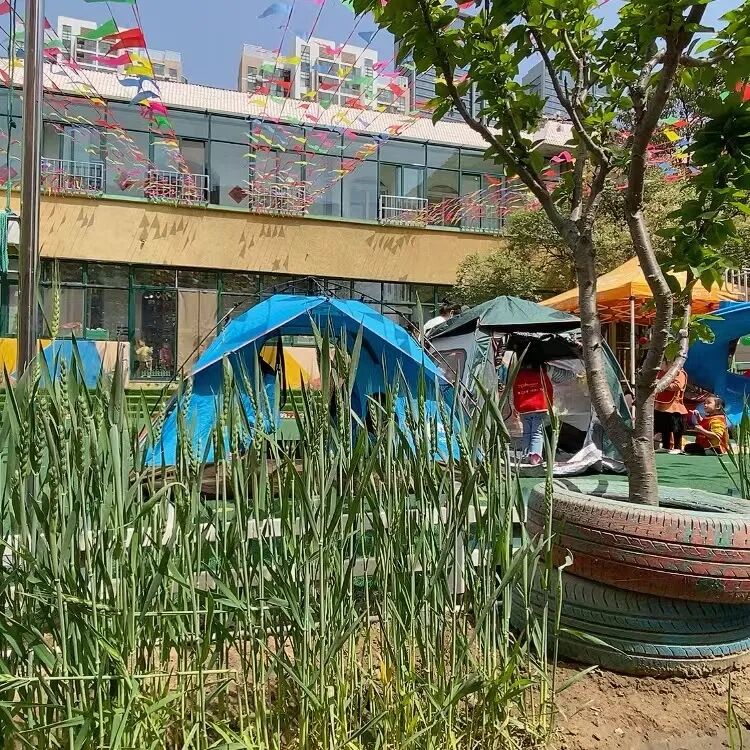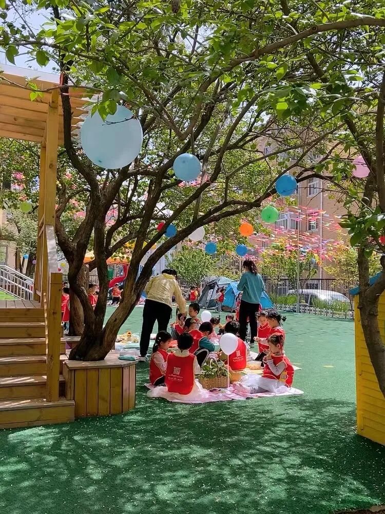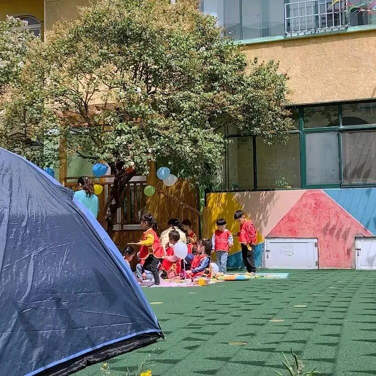 只见丁香树下,小朋友们在——露营。显然是精心准备的:半空中吊了五颜六色的气球,地面铺了野餐地垫,垫子上放着盛了零食的竹篮,小朋友们穿了统一红马甲……充满了野营的欢乐气氛。