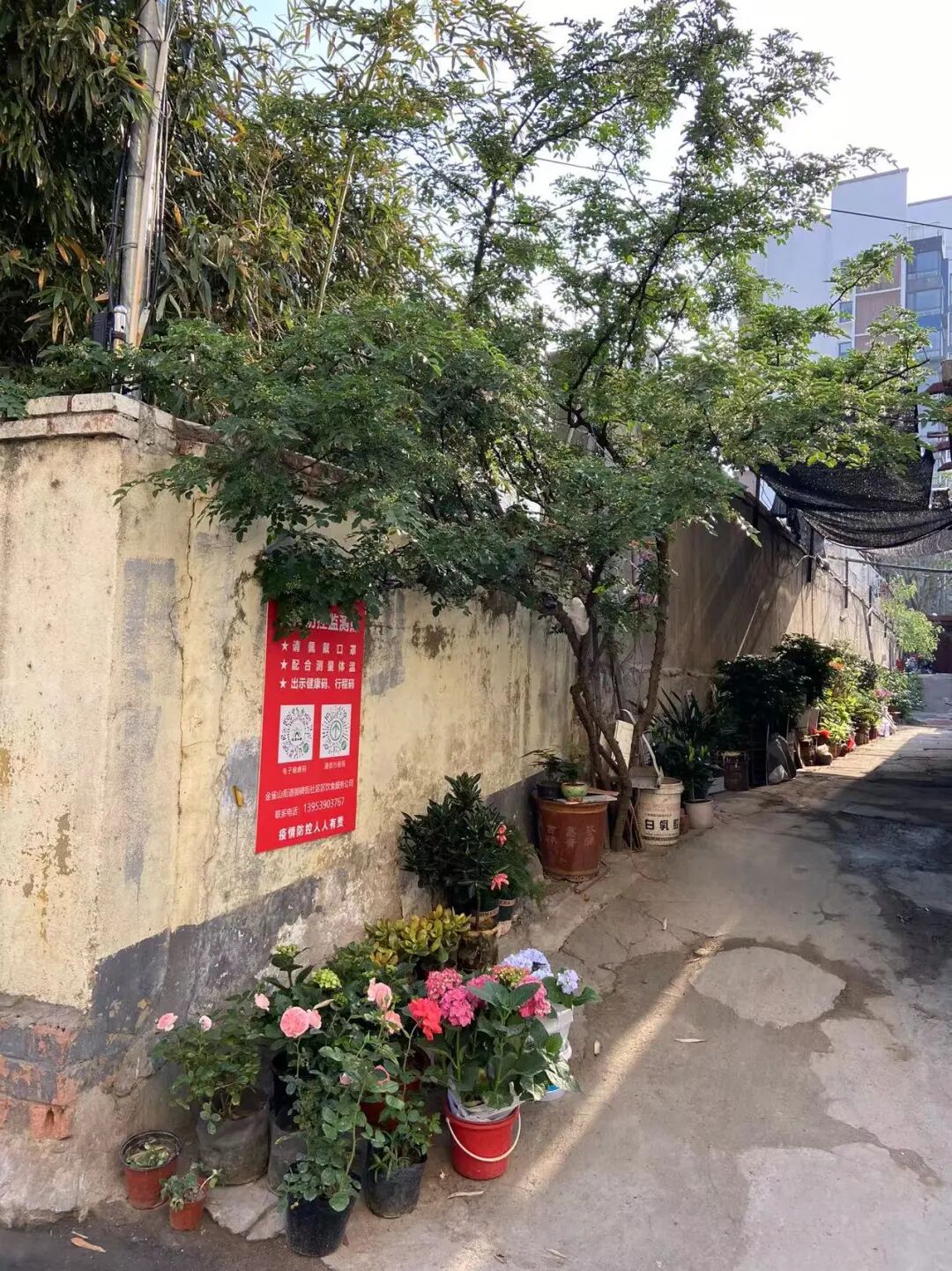 这两天住在我妹妹家,她家小区西边有一条小巷,小巷两侧多菜店药店水果店肴肉店一类的店铺。有家小店因疫情关了门,墙外一棵蔷薇孤零零地开着,还有家馄饨店,好像也兼做起了花卉生意,门前摆了很多盆花,有三角梅,月季,百合等等,也有的花我叫不上名字。
