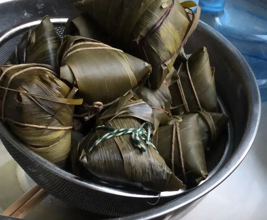 隔了这几年没包粽子,手已经生疏。好在网上教学的视频很多,我照着视频,又好不容易捂巴出了大大小小的十个粽子。