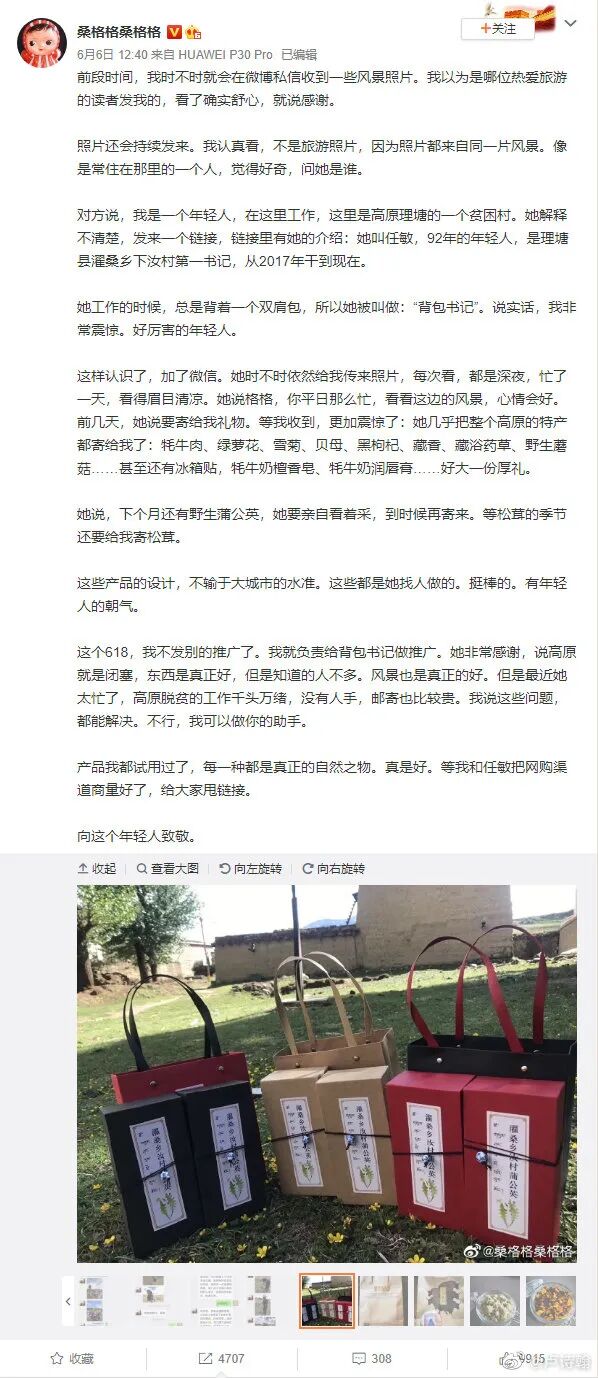 这位背包书记经常给四川籍作家桑格格微博大V私信发风景照片,除了介绍当地风景,她还给桑格格邮寄一些当地特产。