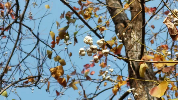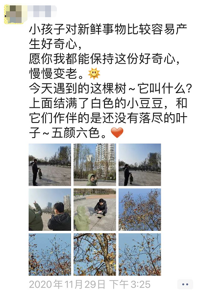 “在滨河步行道散步遇到的,有着漂亮的红叶、结着雪白的小豆豆的,是——乌桕树呀!”