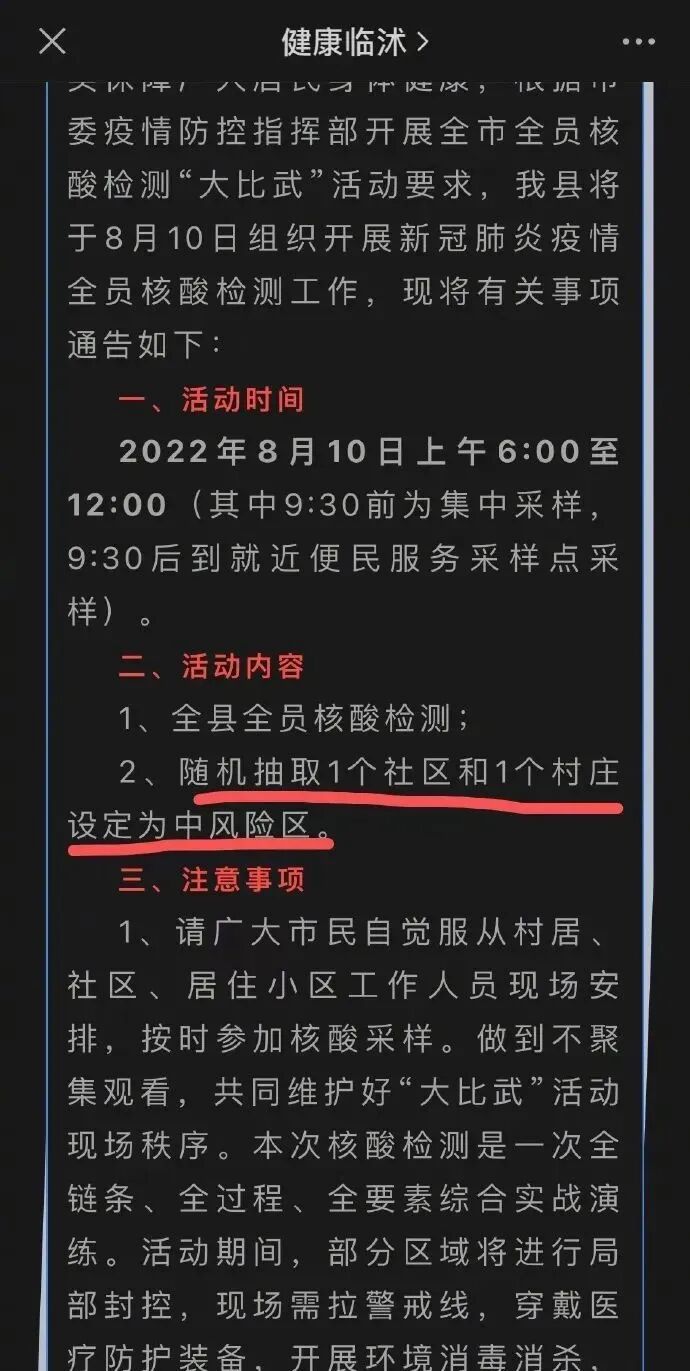 据“健康临沭”公众号,山东省临沂市临沭县应市委疫情防控指挥部开展全市全员核酸检测“大比武”活动要求,于2022年8月10日上午举行“核酸检测大比武”。