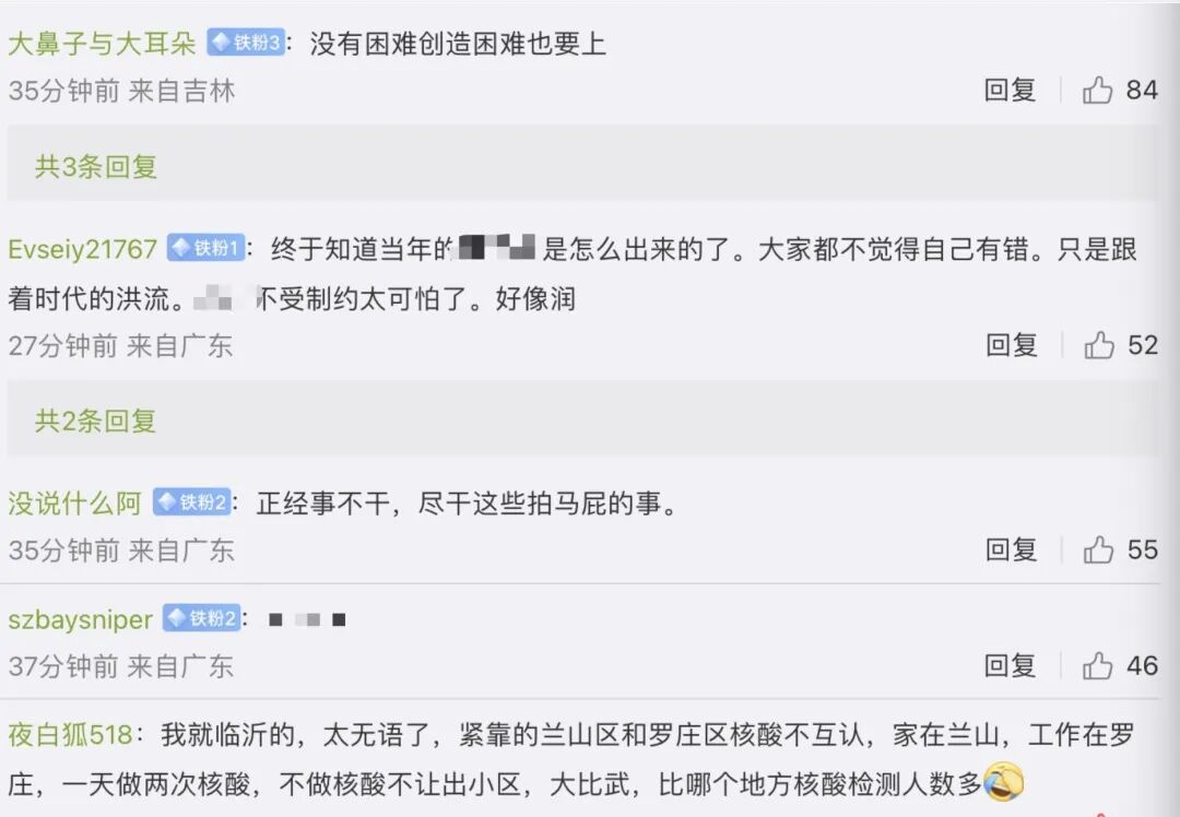 最后那个留言说:我就是临沂的,太无语了。紧靠兰山区和罗庄区核酸不互认,家在兰山,工作在罗庄,一天做两次核酸,不做核酸不让出小区,大比武,比哪个地方核酸检测人数多。