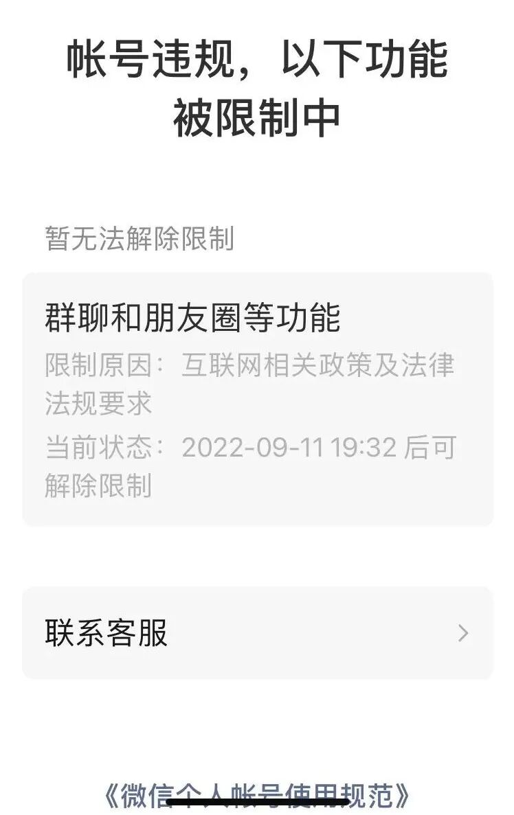 不能发朋友圈,不能群聊,后来才知道“以下功能被限制中”的“群聊和朋友圈等功能”中的“等”,也包括收不到群消息。