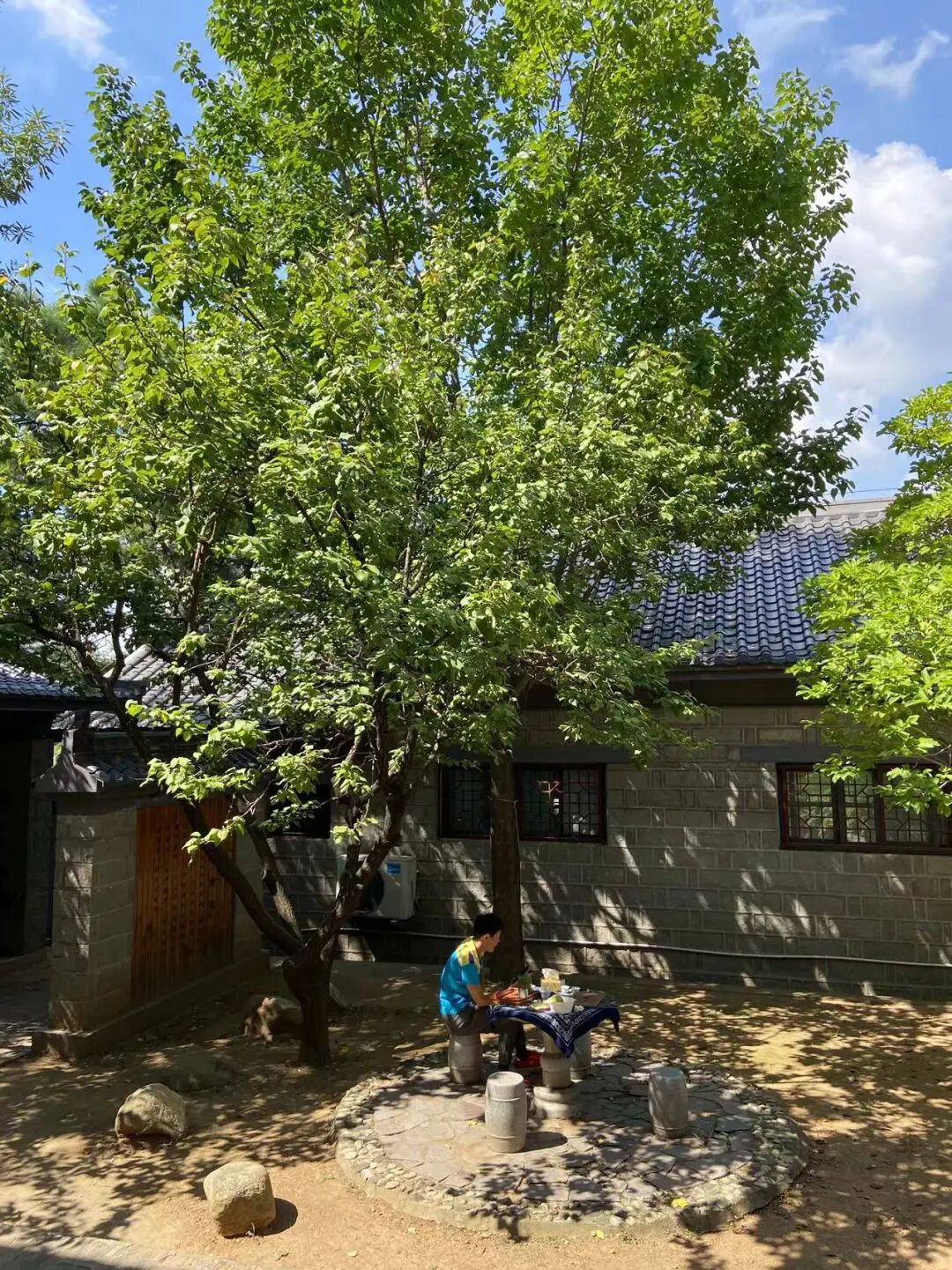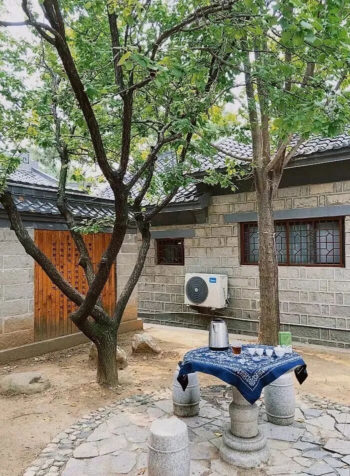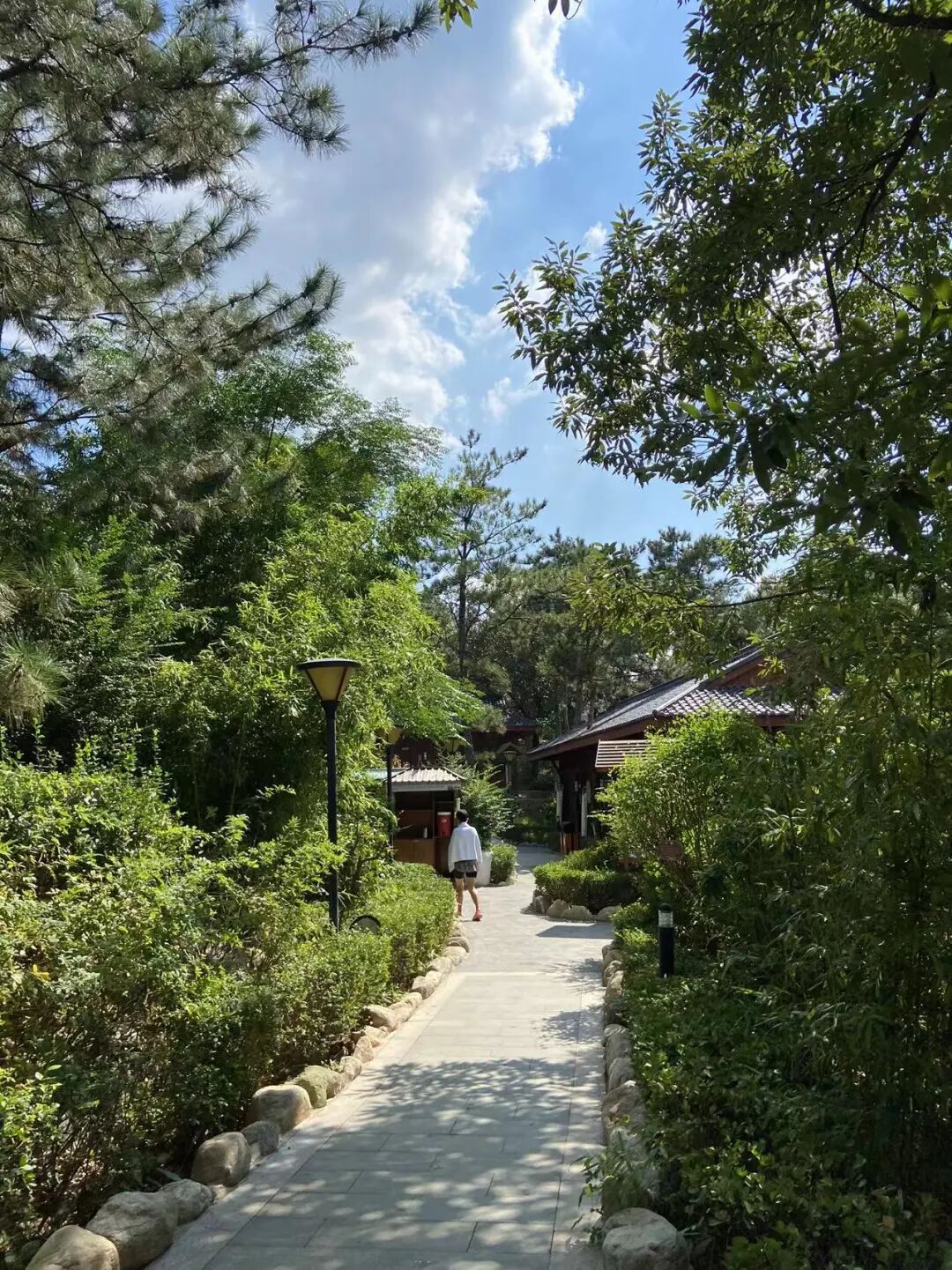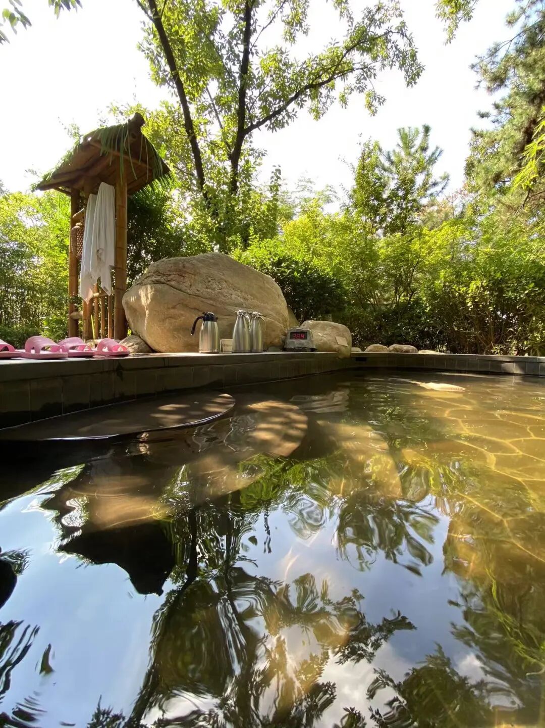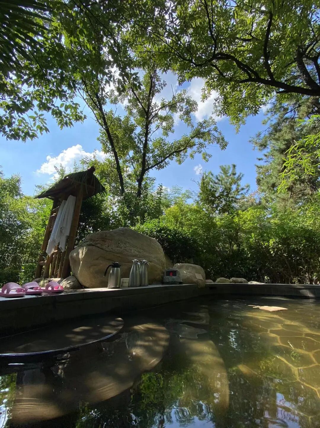 来了两天,每日把茶具拿到庭前一棵杏树下,在那石桌上喝茶,聊天,望天上风卷云舒,倒也惬意;每日去泡一次温泉,我们喜欢室外的温泉,四周树木竹林环绕,听风,观云,赏月,冥想,假装把自己安放在大自然里。
