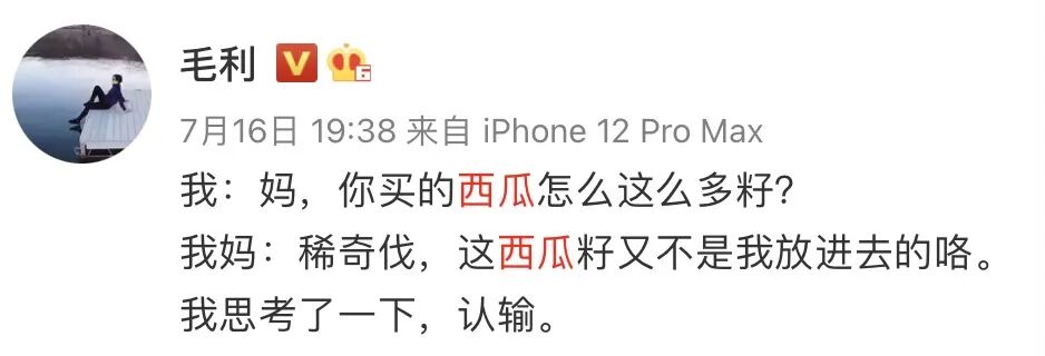有次吃西瓜,她问:妈,你买的西瓜怎么这么多籽?她母亲沈女士道:稀奇伐,这西瓜籽又不是我放进去的咯。