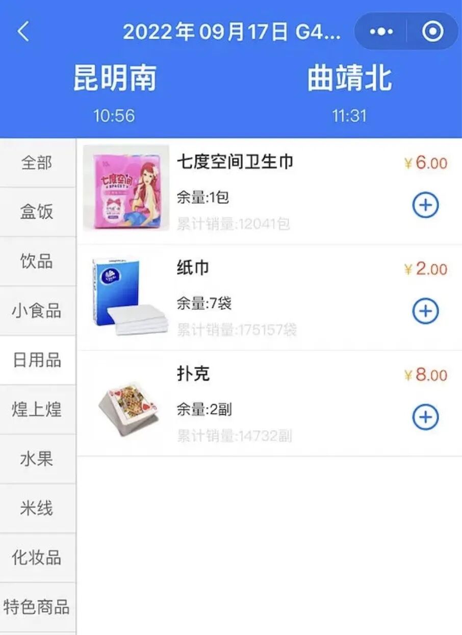 当某些人还在那儿嗷嗷“高铁不卖卫生巾是因为不赚钱”、“囤那么多货卖不出去怎么办”、“有几个人会在高铁上买卫生巾”、“女性的特殊需求凭什么让大众买单”时,据说,昆明高铁早就已经上架了卫生巾,并悄悄卖出了一万两千多包。