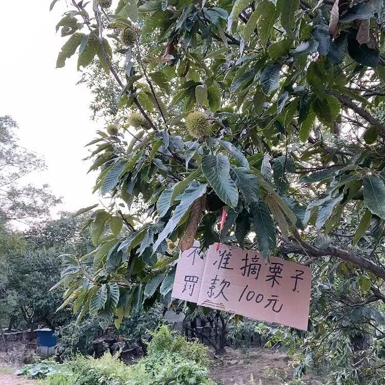 板栗也不好随便捡。山林都是个人承包的,每一棵栗子树都有主人。通往蒙山的主道有一片栗树林,最靠近马路的一棵树上挂着牌子: