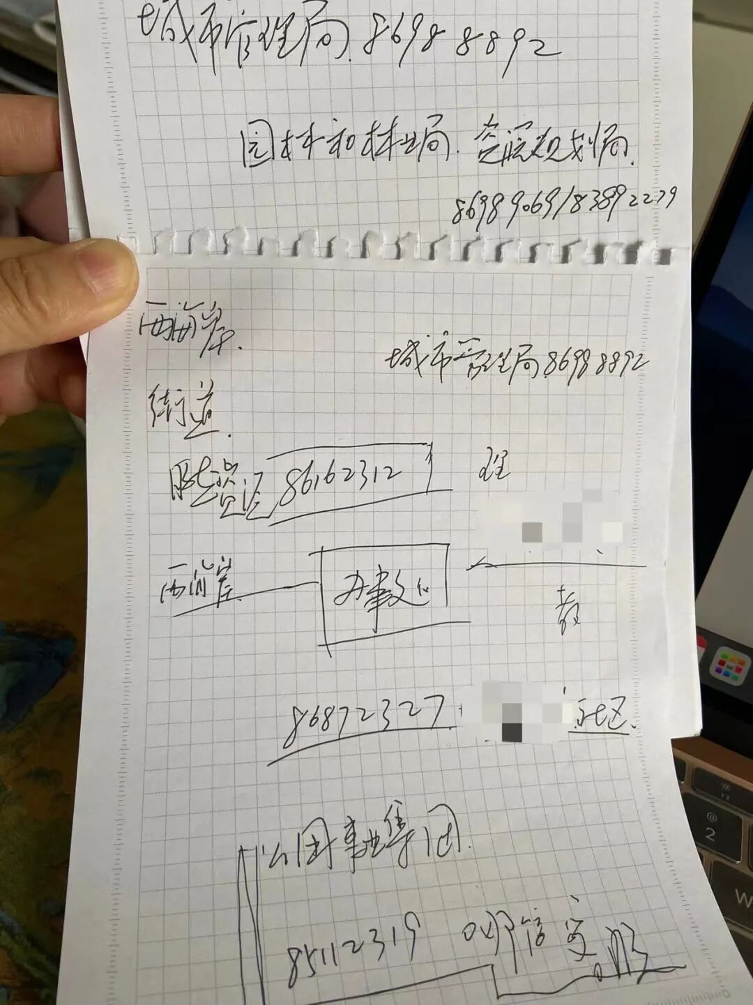 电话中,我把从昨天到现在打过电话的部门罗列一番:园林局,自然资源管理局(也可能叫自然资源规划局),城市管理局,办事处,社区,期间还打过公用事业集团的电话。