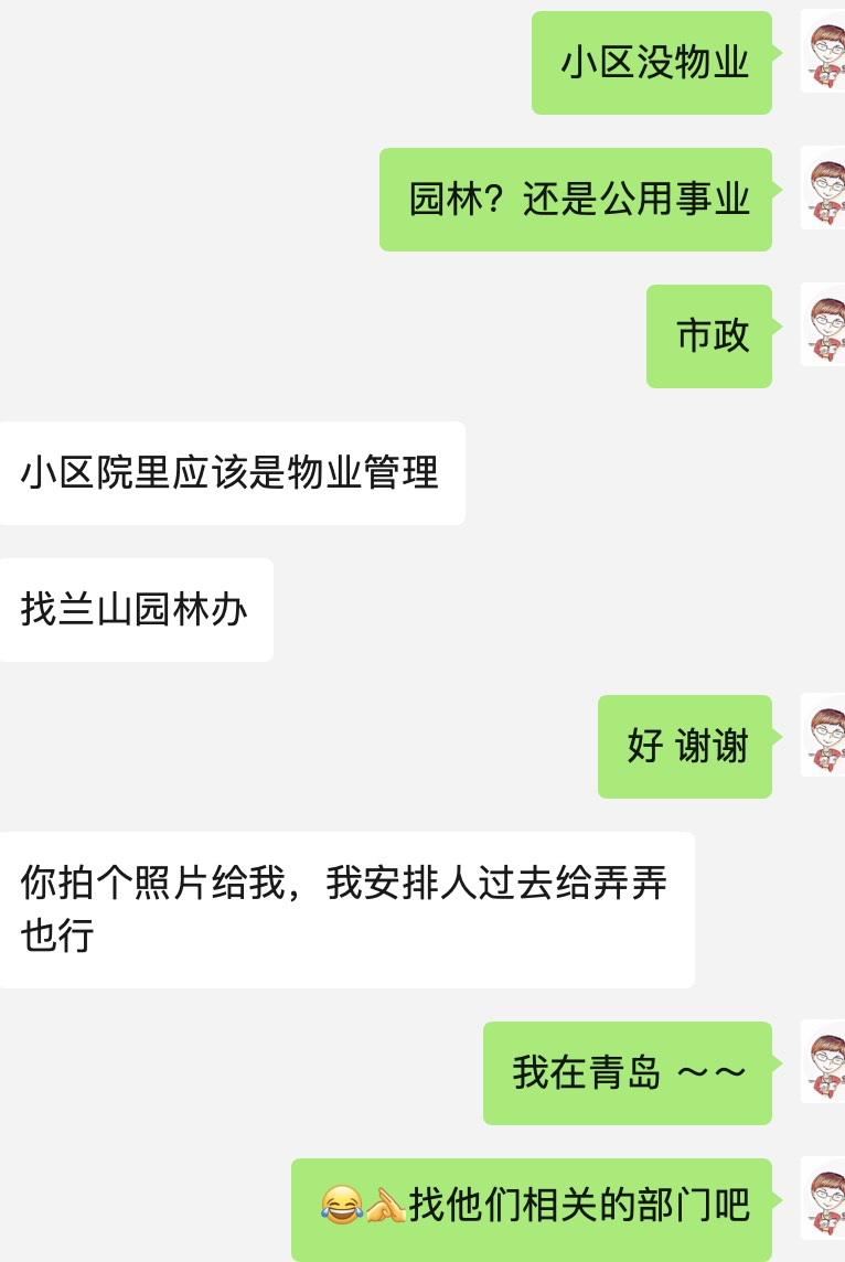 一咨询,果然她让我找园林办。还说“你拍个照片给我,我安排人过去给弄弄也行。”