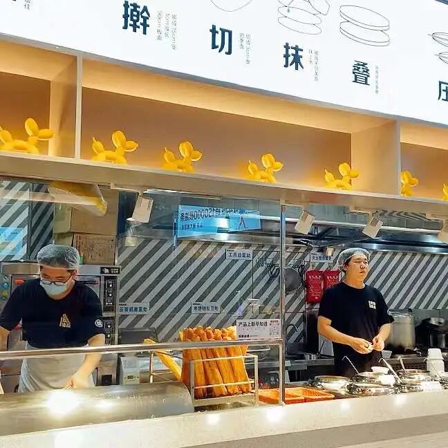 西街油条铺在沿街,很好找。可能是防疫需要,沿街的门关闭着,需要走商业街后面的通道进去。我一看店面装修和规模就知道,很专业。就没见过这么漂亮的显然是设计了整套视觉体系的油条铺。