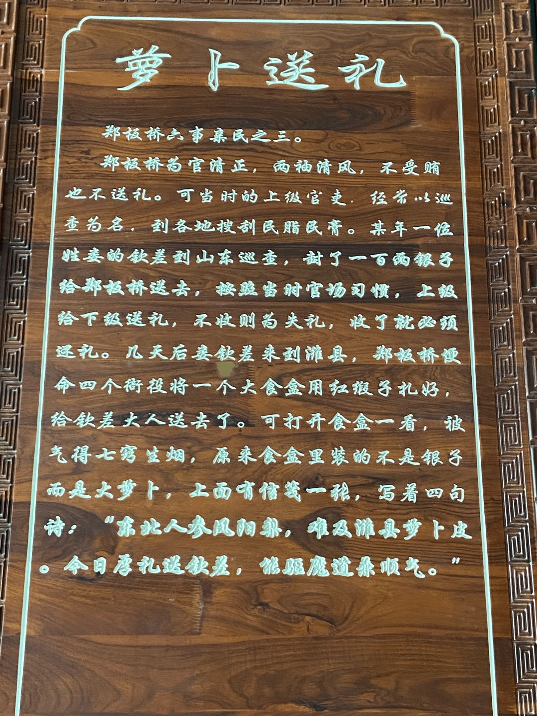 在郑板桥纪念馆,我还拍了张《乳母诗》。最后一句“食禄千万钟,不如饼在手。”让我想到潍坊三大名小吃之一的潍坊火烧。有这句诗,简直可以量产“板桥烧饼”。