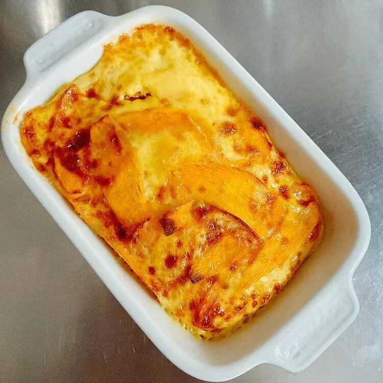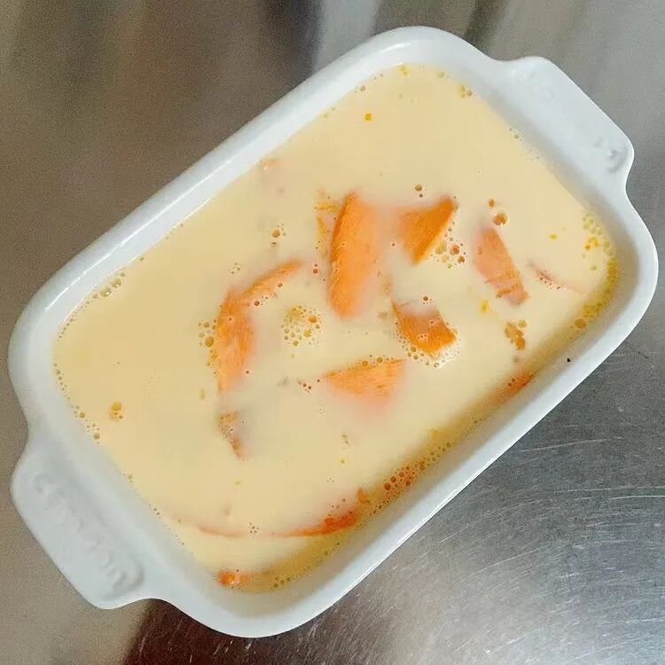 1,红薯(300克左右)去皮,用刀或削皮器切削成片状,放入刷过食用油的焗碗中(红薯片不要压实,留有缝隙蛋液更易渗入)。