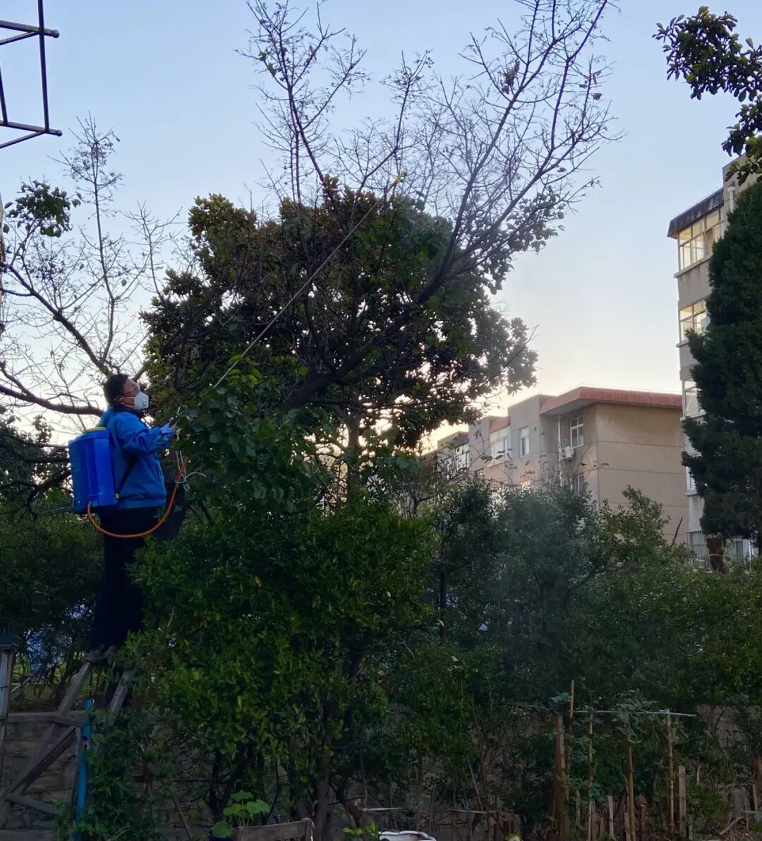 他踩着一个破木梯,给树喷了一遍药,实在够不着的地方,也是没办法。