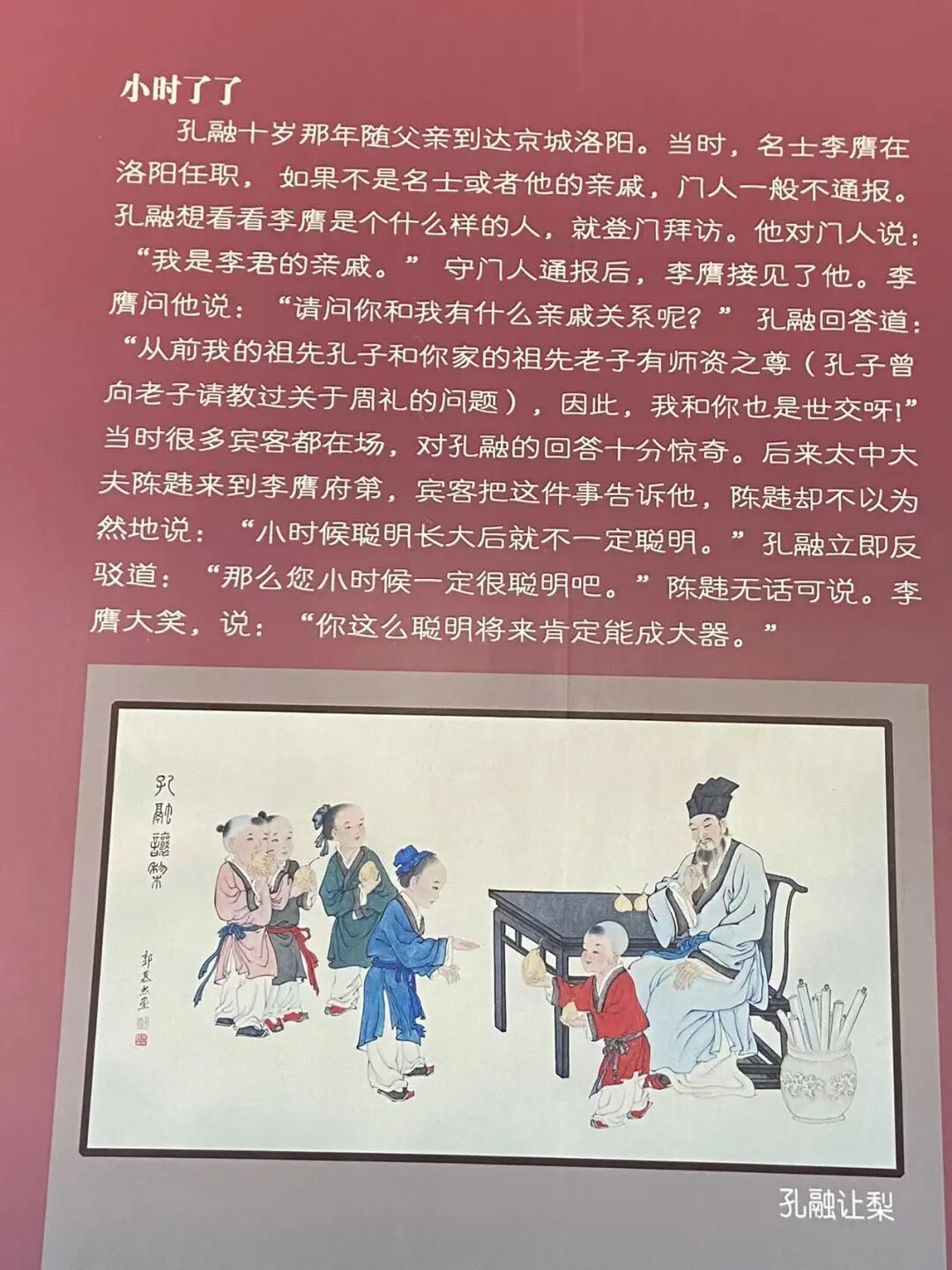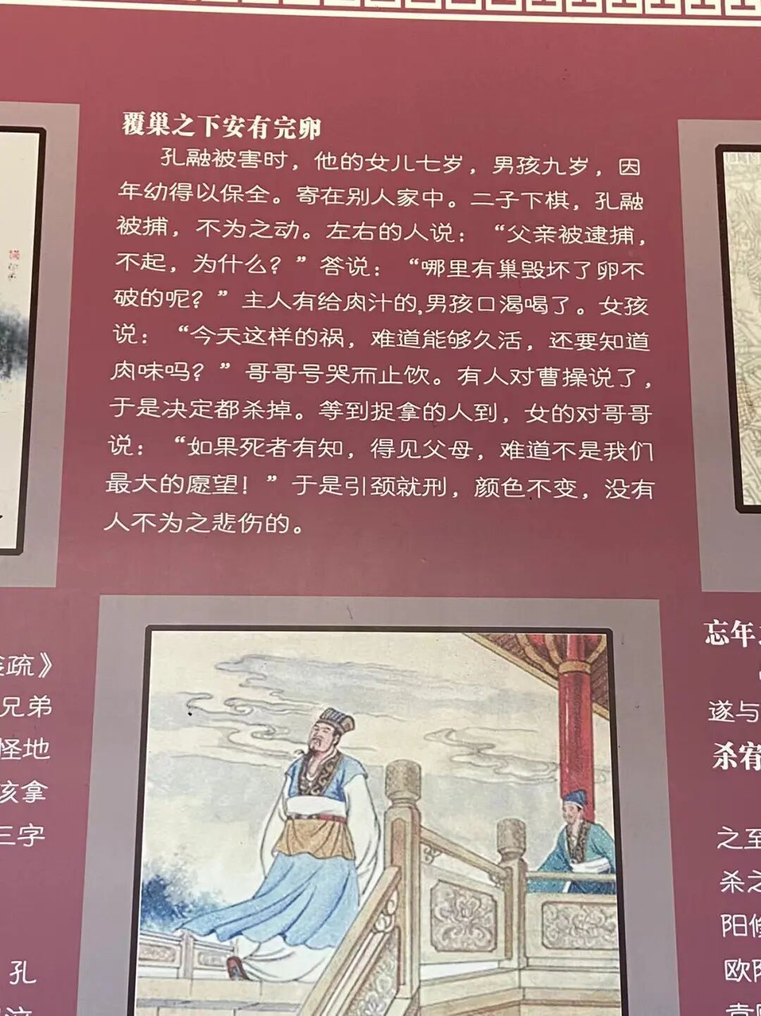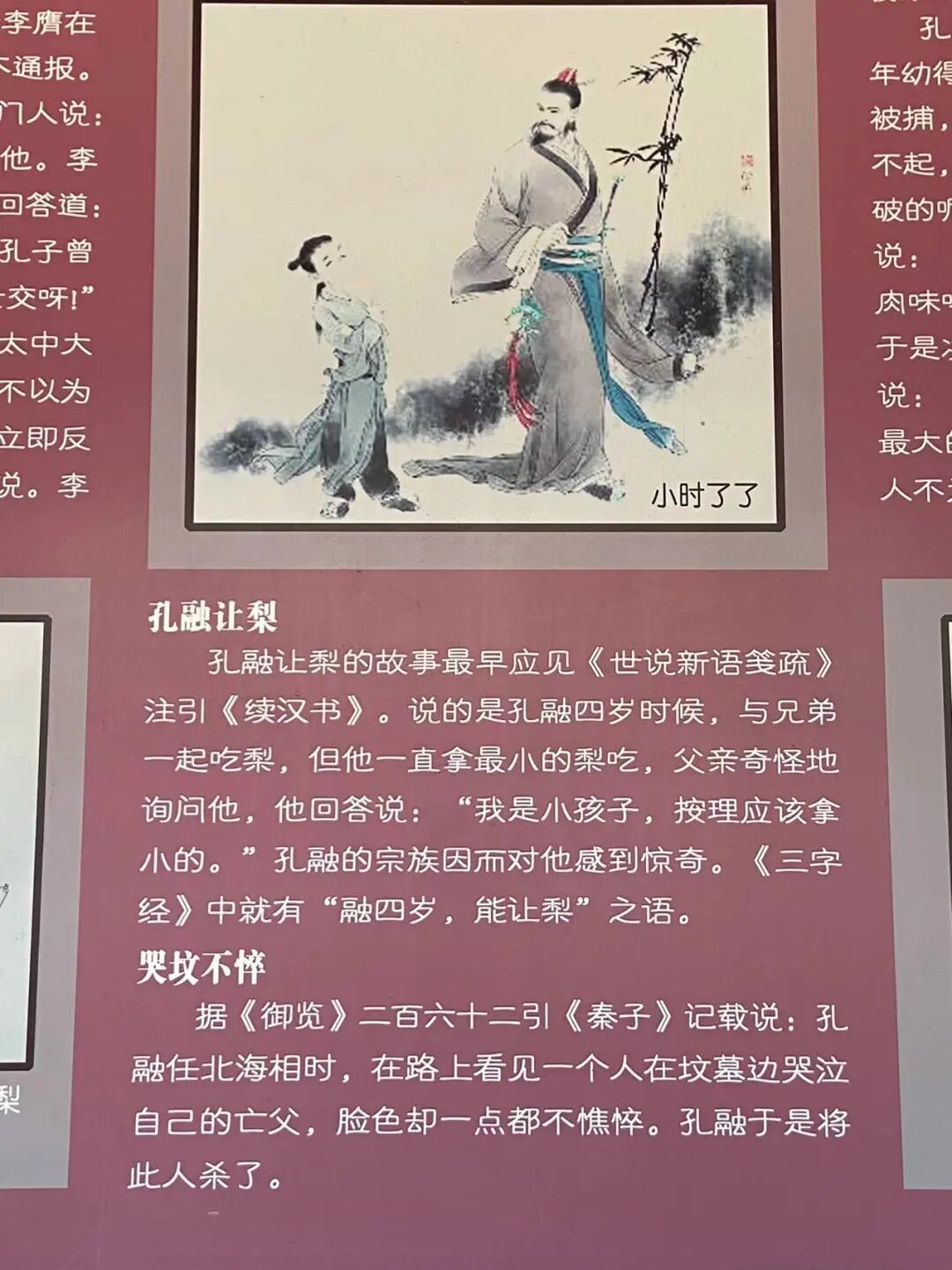 在孔融祠墙壁上有几个小故事,除了家喻户晓老少皆知的“四岁让梨”,“小时了了”,另外两个,引起了我的不适。